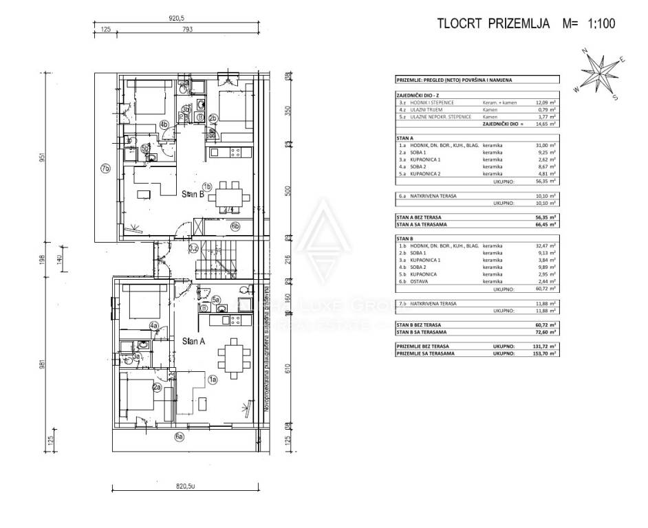 DOSTUPNE JEDINICE I CIJENE Prizemlje s pogledom na more: 275.000 € (uključuje dvorište ispred balkona, cca 42 m²) Kat s pogledom na more: 265.000 € Prizemlje orijentirano prema ulici s pogledom na more: 255.000 € Kat orijentiran prema ulici s pogledom na more: 245.000 €
