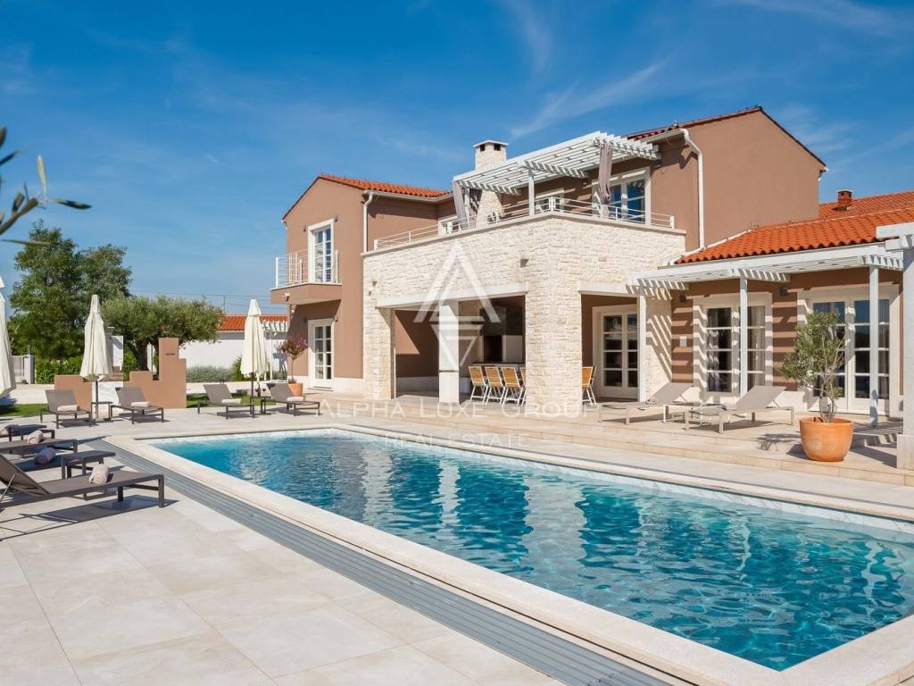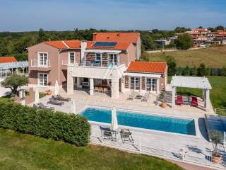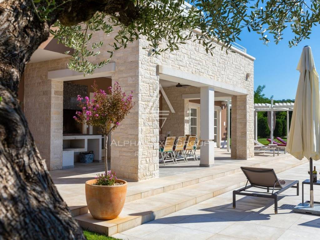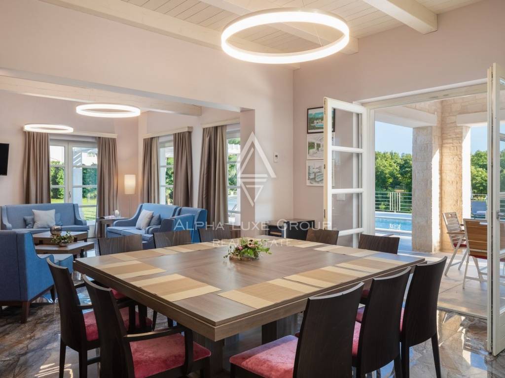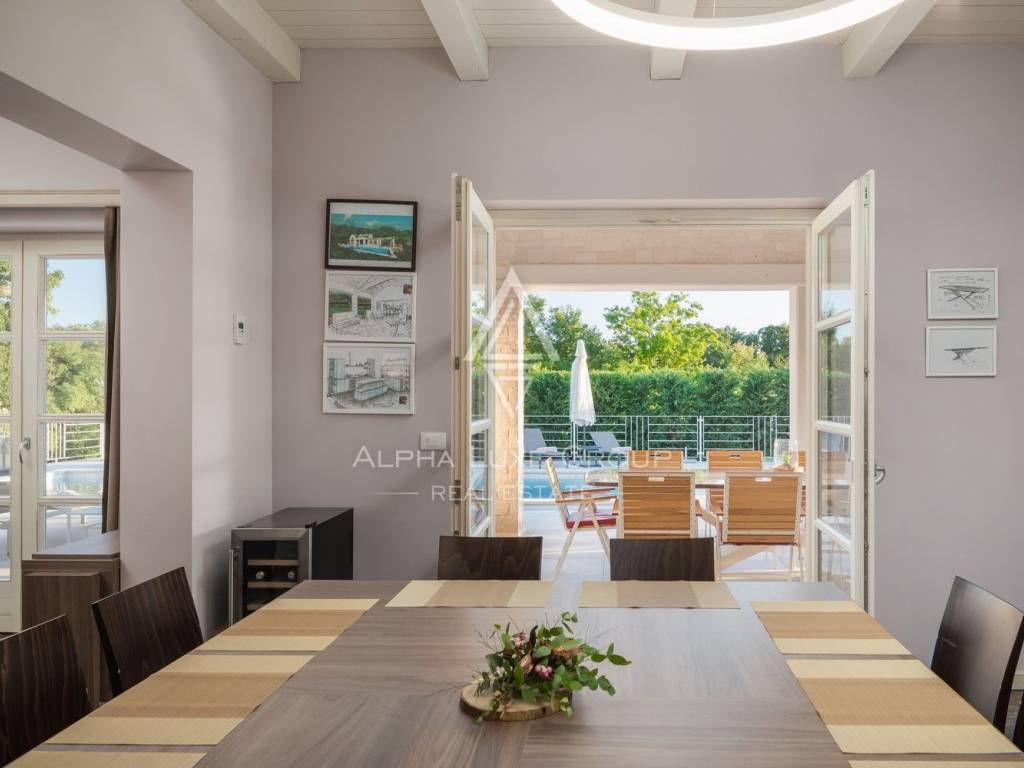 Set in a peaceful area near Svetvinčenat, this refined villa combines modern comfort, spacious interiors and premium amenities, creating an ideal environment for year-round living or luxury holidays. Spanning 332 m² across two levels, the property offers a thoughtful layout designed for privacy, relaxation and seamless indoor–outdoor living. The ground floor opens with a generous entrance hall leading to a laundry room and storage area, followed by a contemporary kitchen connected to the dining area and living room. Large glass doors open onto a covered terrace equipped with a hot tub, forming the perfect spot for unwinding in any season.