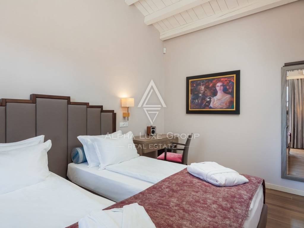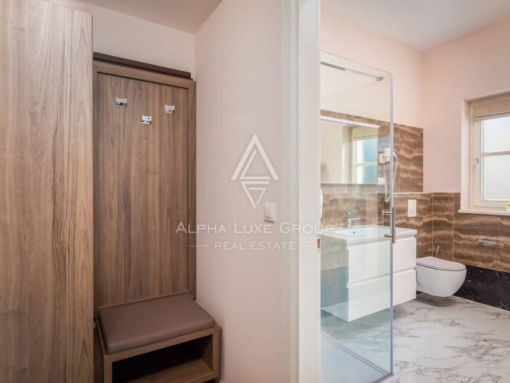 The ground floor also includes two beautifully designed bedrooms, each with a private bathroom and its own walk-in wardrobe. Just below the terrace lies a heated 48 m² swimming pool, complemented by a spacious 150 m² pool deck offering ample room for sunbathing, lounging and outdoor gatherings. Enhancing comfort, a separate fitness and spa house stands beside the main villa, featuring workout equipment and a sauna—ideal for private relaxation and wellness.