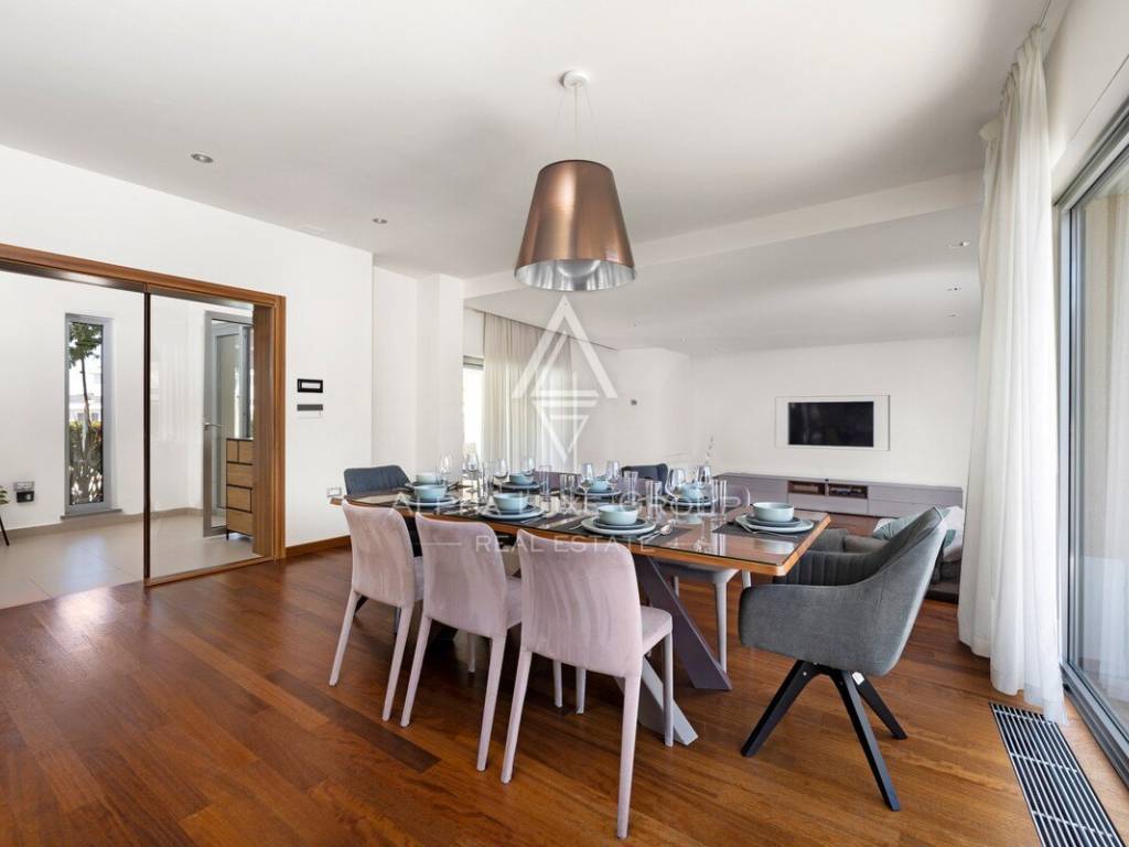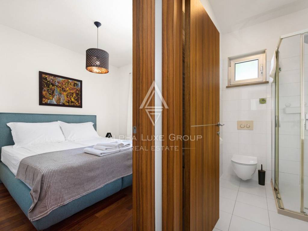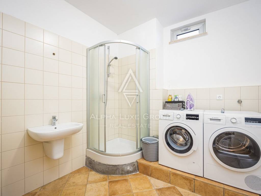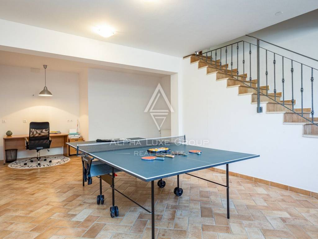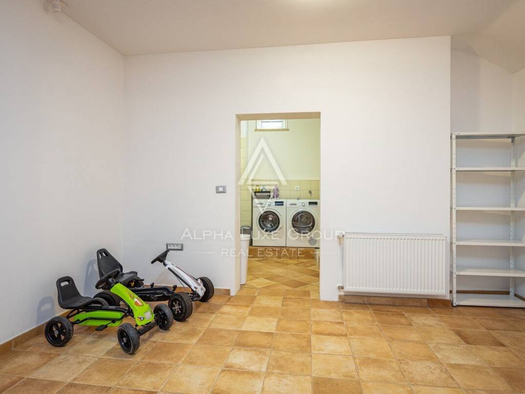 Upstairs, the master suite features a king size bedroom, private bathroom with hydromassage bathtub and a balcony offering panoramic sea views. The lower level provides generous multifunctional space suitable for a recreation room, wellness zone, office or wine cellar, along with two additional connecting rooms, a bathroom, storage room, laundry room and a double garage.