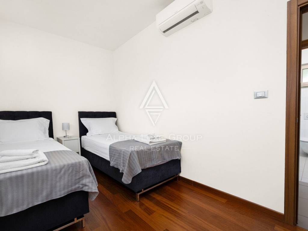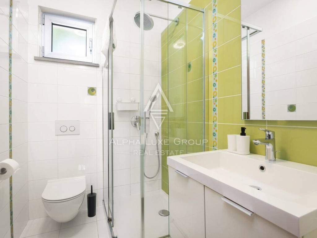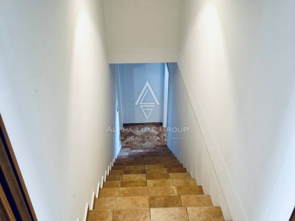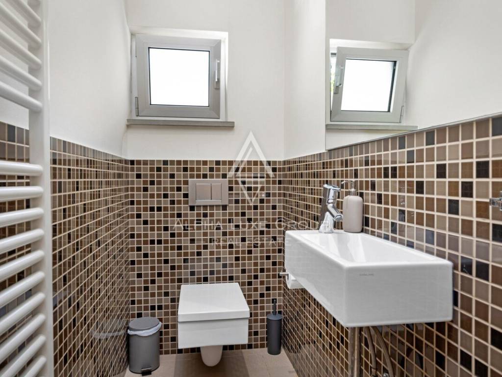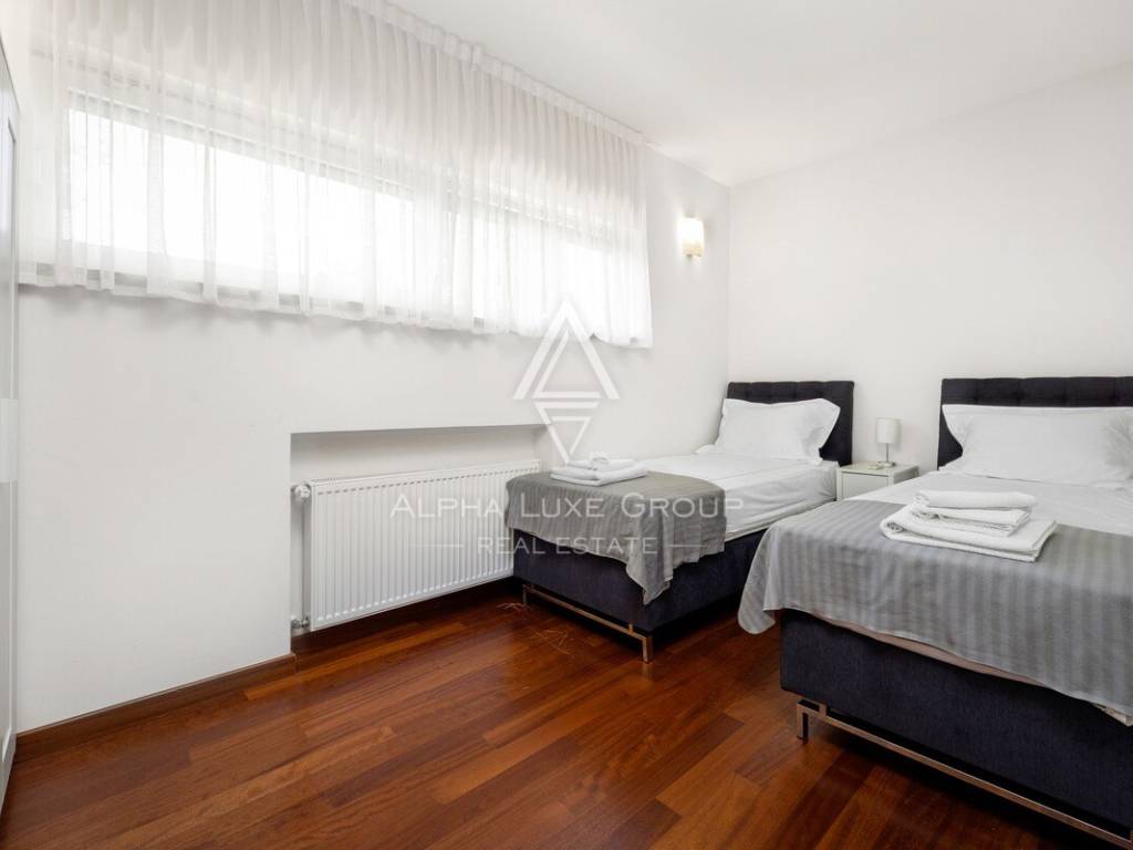 Upstairs, the master suite features a king size bedroom, private bathroom with hydromassage bathtub and a balcony offering panoramic sea views. The lower level provides generous multifunctional space suitable for a recreation room, wellness zone, office or wine cellar, along with two additional connecting rooms, a bathroom, storage room, laundry room and a double garage.