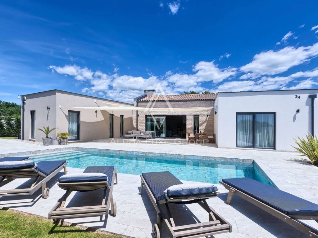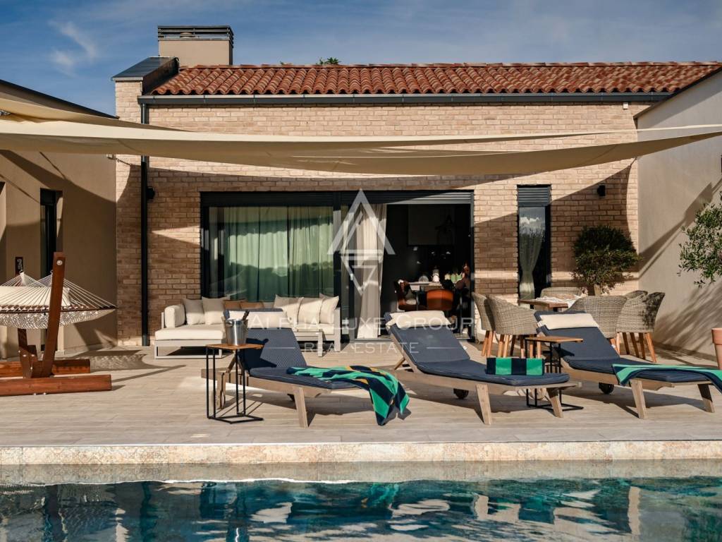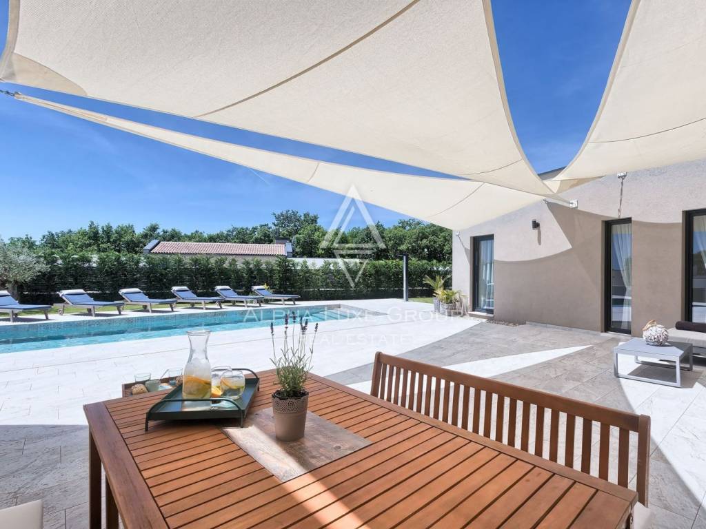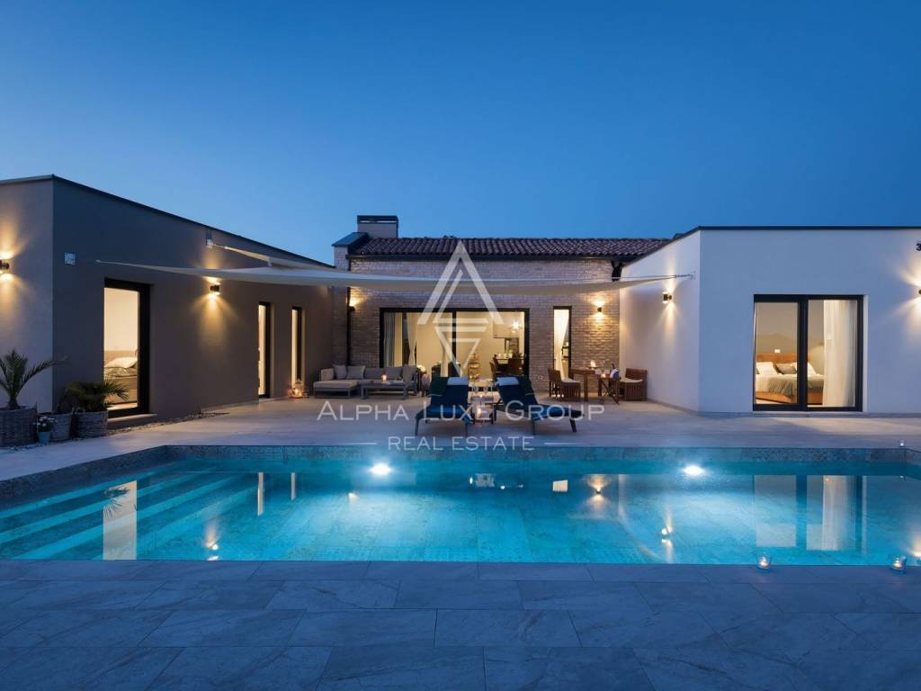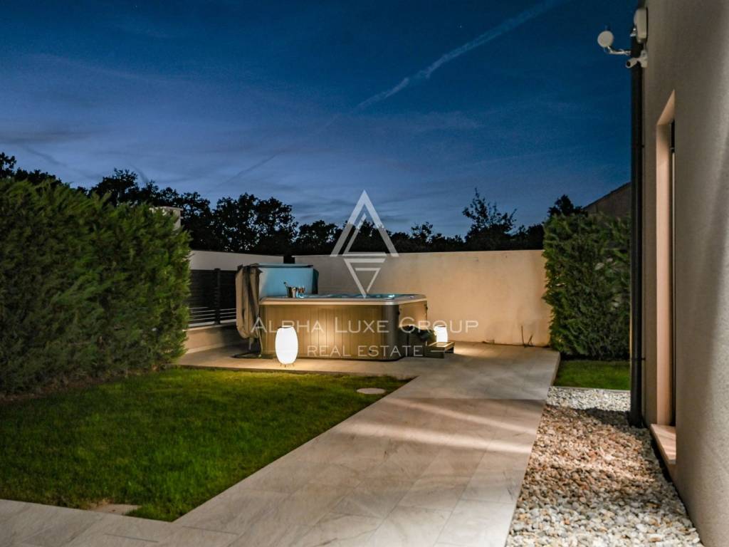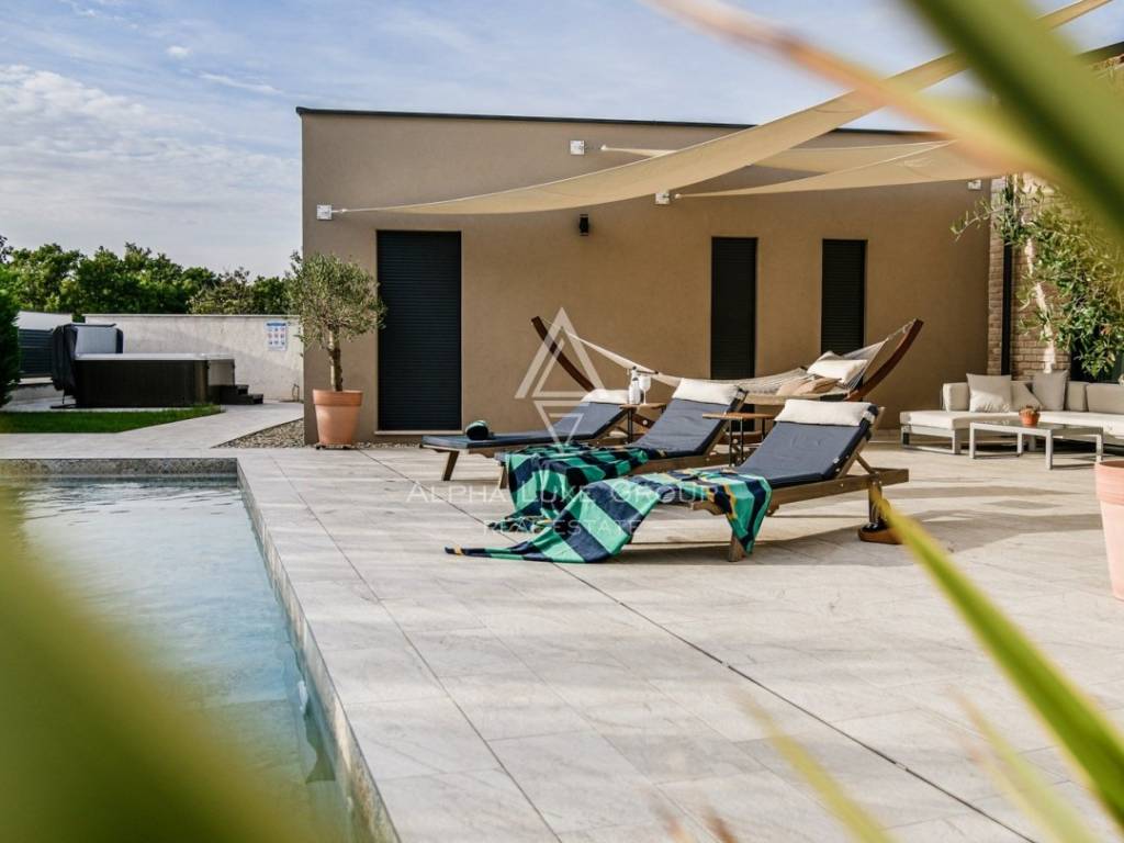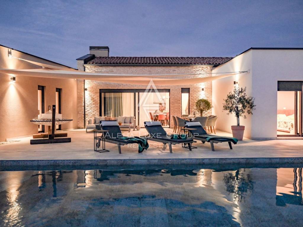 This refined villa for sale near Vodnjan offers an exceptional blend of modern comfort, privacy and elegant contemporary design. Set in a quiet, landscaped environment only minutes from the town, the property was built in 2020 using high-quality materials that enhance both aesthetics and functionality. The single-storey layout extends across 148 m², including 123 m² of interior living space and an additional 25 m² dedicated to a fully equipped summer kitchen.