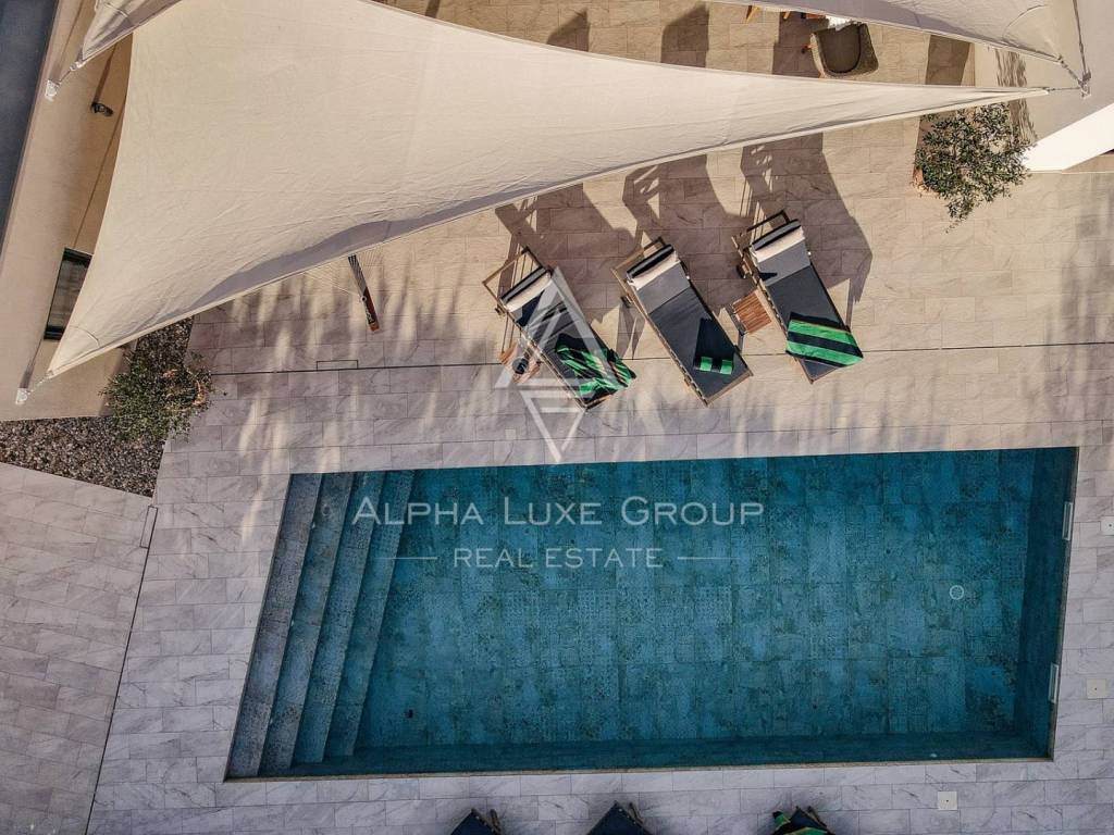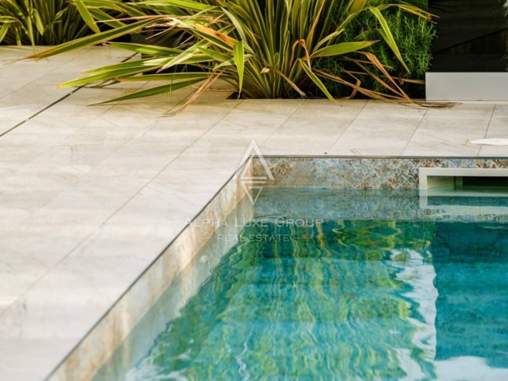 The fenced 830 m² plot includes a 35 m² heated pool, jacuzzi and a covered summer kitchen with a barbecue and dining space, ideal for year-round enjoyment. Additional amenities include parking for three cars, an electric vehicle charging station, video surveillance, alarm system, automatic gate and a water-softening device. Underfloor heating and air conditioning are installed throughout the villa. Furniture is not included in the price.