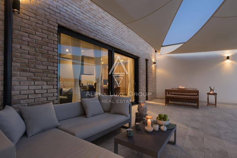 The interior features an airy open-plan concept connecting the stylish kitchen, dining area and bright living room. Large glass walls bring in abundant natural light and create a seamless flow to the outdoor terrace and landscaped garden. The villa offers three comfortable bedrooms; the master suite includes a private bathroom, while the remaining two bedrooms share a modern second bathroom. Every room has direct access to the garden, enhancing the sense of openness. A guest toilet adds extra convenience.