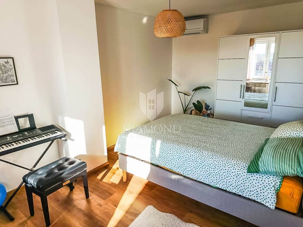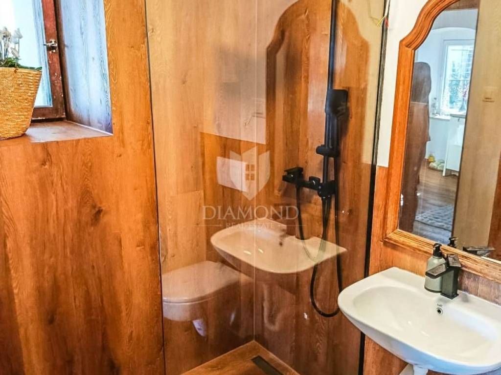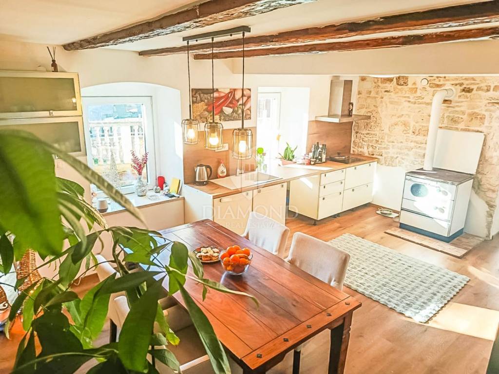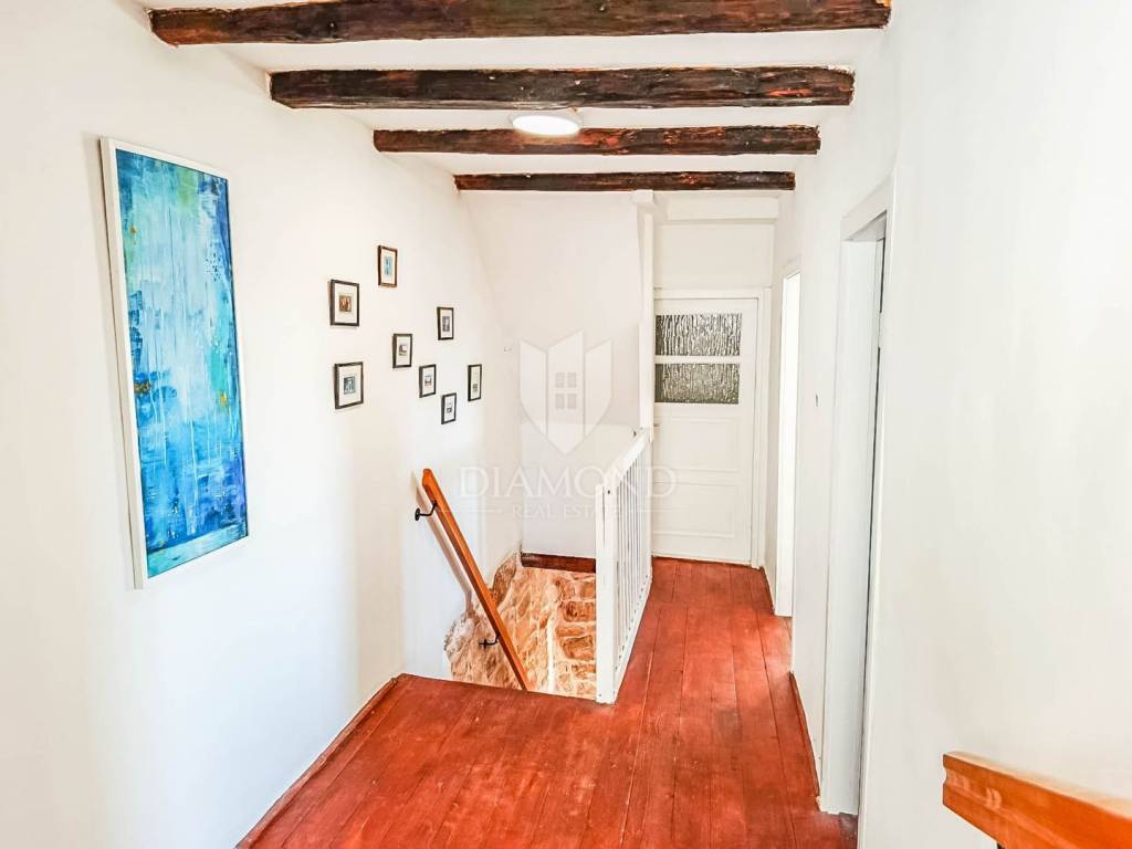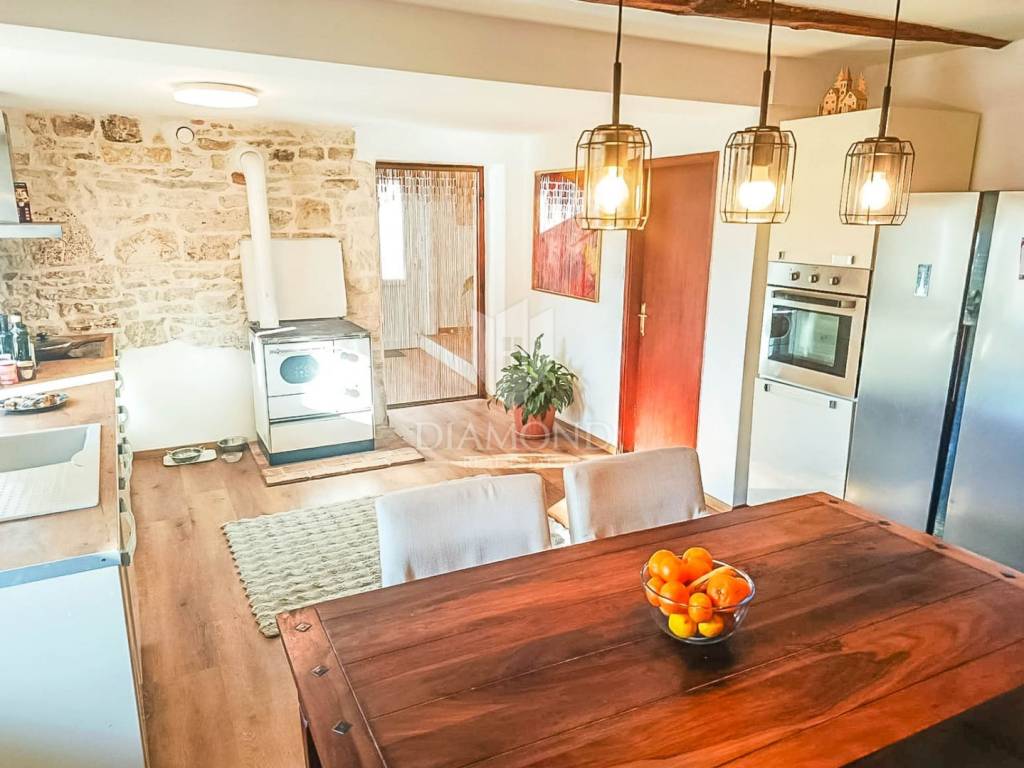 In 2025, the façade and roof were renewed, the interior fully refurbished, PVC windows and doors installed, air-conditioning units fitted, and water and electrical installations replaced, along with new gutters. The house is sold fully furnished, meaning the buyer receives a true “turnkey” solution—ready to move in immediately or to place on the market. What makes this home truly special is its authentic Istrian character, carefully blended into a modern, bright and comfortable interior. Antique wooden beams and restored stone walls create a warm, traditional atmosphere while providing excellent insulation and year-round comfort. This fusion of old and new sets the house apart from typical renovations and gives it the feel of a home with a soul. In the yard there is a traditional tavern (konoba) with a large open fireplace designed for gatherings, additionally equipped with a kitchen—an ideal setting for family celebrations, weekends with friends and true Istrian evenings all year round. The yard offers parking for four cars, and a charming small vegetable garden—perfect for those who enjoy home-grown herbs and produce.