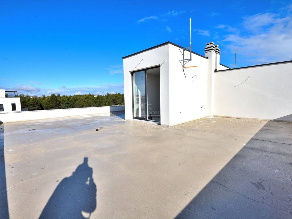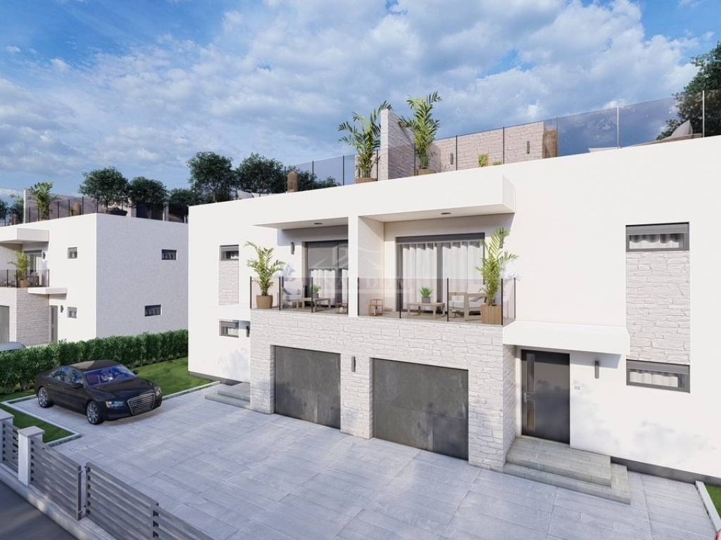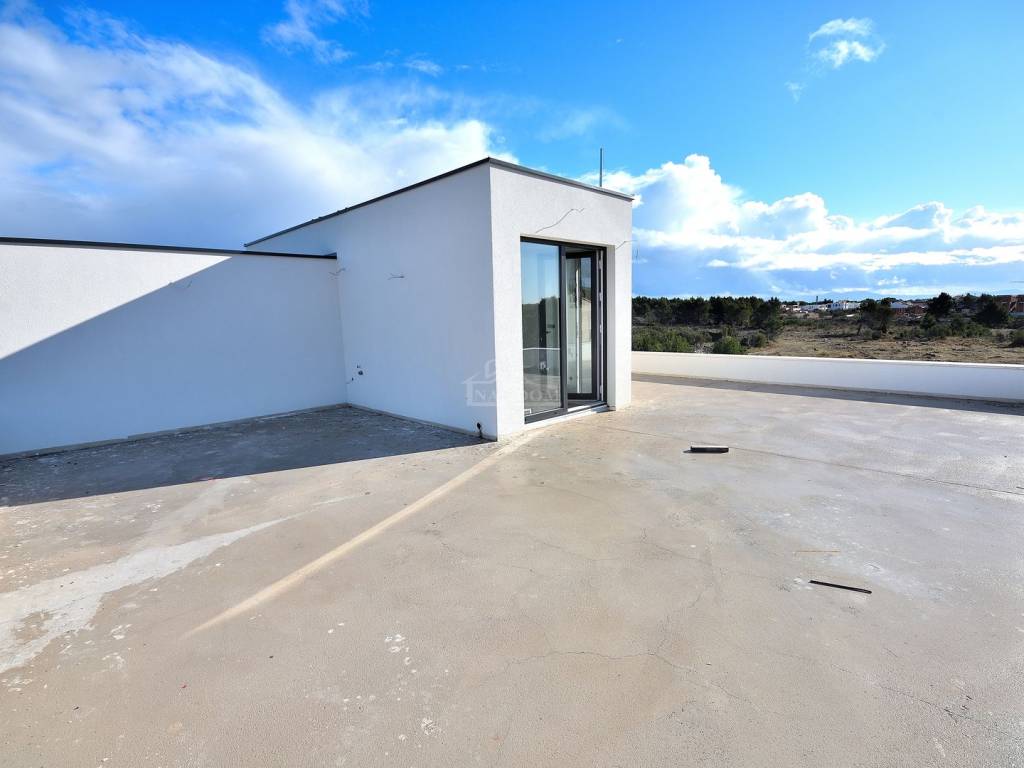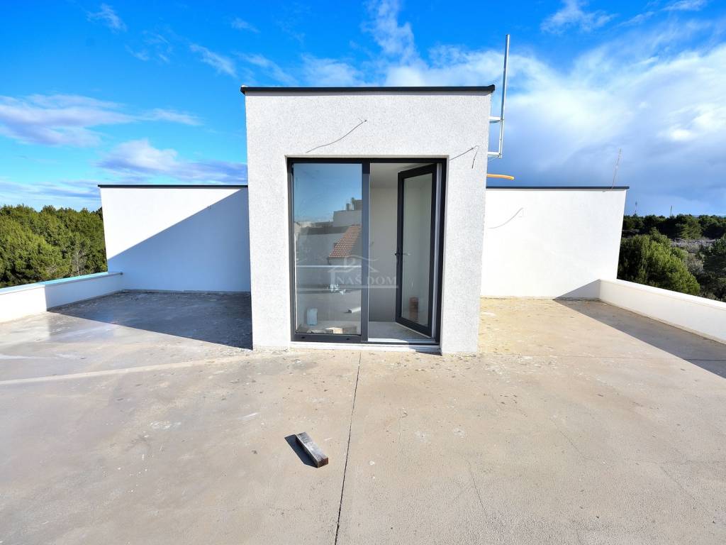 Vodice- prodaje se dvojna kuća s bazenom i krovnom terasom, 550 m od plaže. Kuća katnica moderne arhitekture ukupne neto površine 204,40 m2 ima tri etaže: prizemlje+kat+ 2 kat. Prizemlje se sastoji od: garaža površine 22,40 m2, natkriveni ulaz, hodnik, tehnička soba, wc, kuhinja s blagovaonicom i dnevni boravak open space rasporeda s izlazom na natkrivenu terasu površine 14,35m2. Unutarnjim stubištem se ide na prvu etažu kuće gdje se nalazi hodnik, dvije spavaće sobe s izlazima na zajednički natkriveni balkon površine 10,30m2, zajednička kupaonica te master spavaća soba s garderobom i vlastitom kupaonicom i izlazom na natkrivenu terasu površine 5,55m2. Unutarnjim stubištem se ide na zadnju etažu kuće koja se sastoji od krovne terase površine 92,15m2. Kući pripada okućnica površine 280m2, koja se sastoji od bazena dimenzija 3,50 m * 6.50 m, vrta koji će biti kultiviran mediteranskim biljem i popločanog parkirnog prostora.