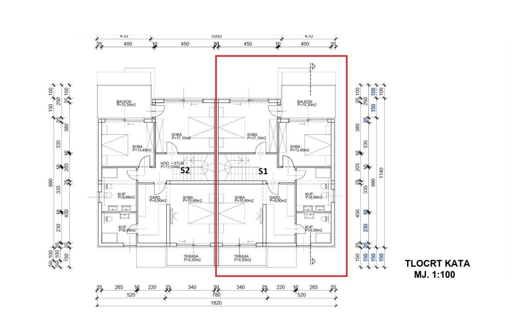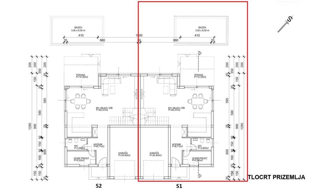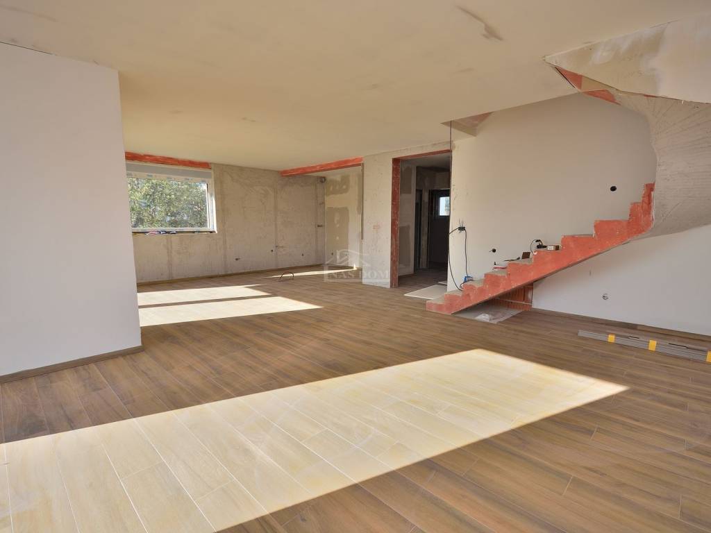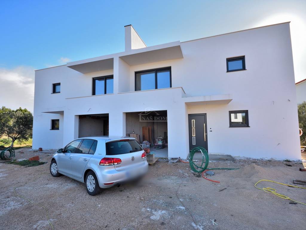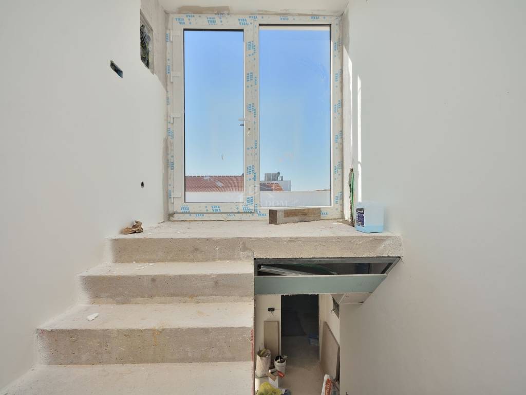 Vodice- prodaje se dvojna kuća s bazenom i krovnom terasom, 550 m od plaže. Kuća katnica moderne arhitekture ukupne neto površine 204,40 m2 ima tri etaže: prizemlje+kat+ 2 kat. Prizemlje se sastoji od: garaža površine 22,40 m2, natkriveni ulaz, hodnik, tehnička soba, wc, kuhinja s blagovaonicom i dnevni boravak open space rasporeda s izlazom na natkrivenu terasu površine 14,35m2. Unutarnjim stubištem se ide na prvu etažu kuće gdje se nalazi hodnik, dvije spavaće sobe s izlazima na zajednički natkriveni balkon površine 10,30m2, zajednička kupaonica te master spavaća soba s garderobom i vlastitom kupaonicom i izlazom na natkrivenu terasu površine 5,55m2. Unutarnjim stubištem se ide na zadnju etažu kuće koja se sastoji od krovne terase površine 92,15m2. Kući pripada okućnica površine 280m2, koja se sastoji od bazena dimenzija 3,50 m * 6.50 m, vrta koji će biti kultiviran mediteranskim biljem i popločanog parkirnog prostora.