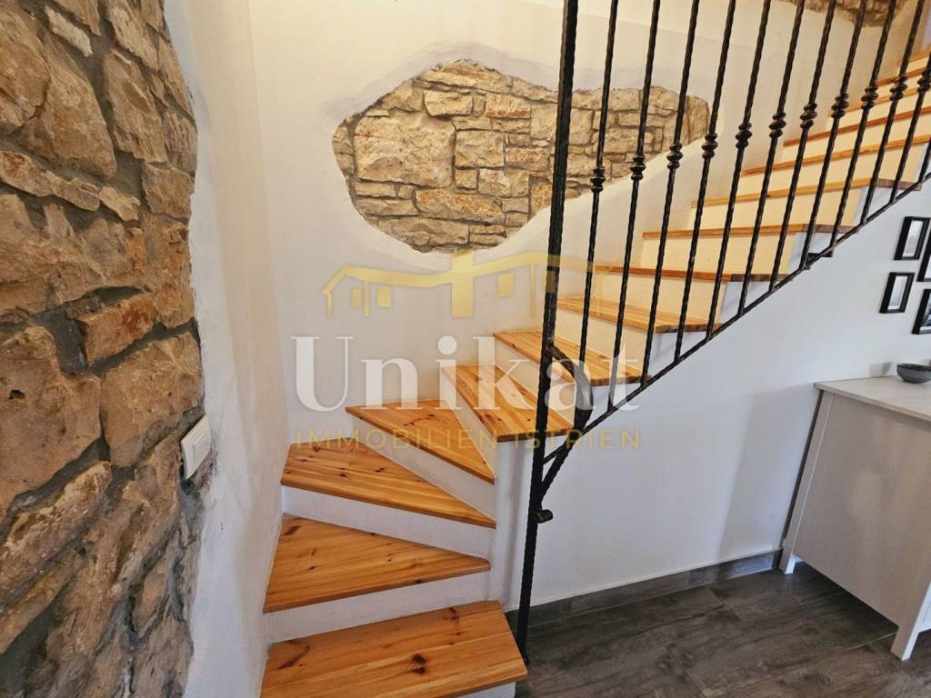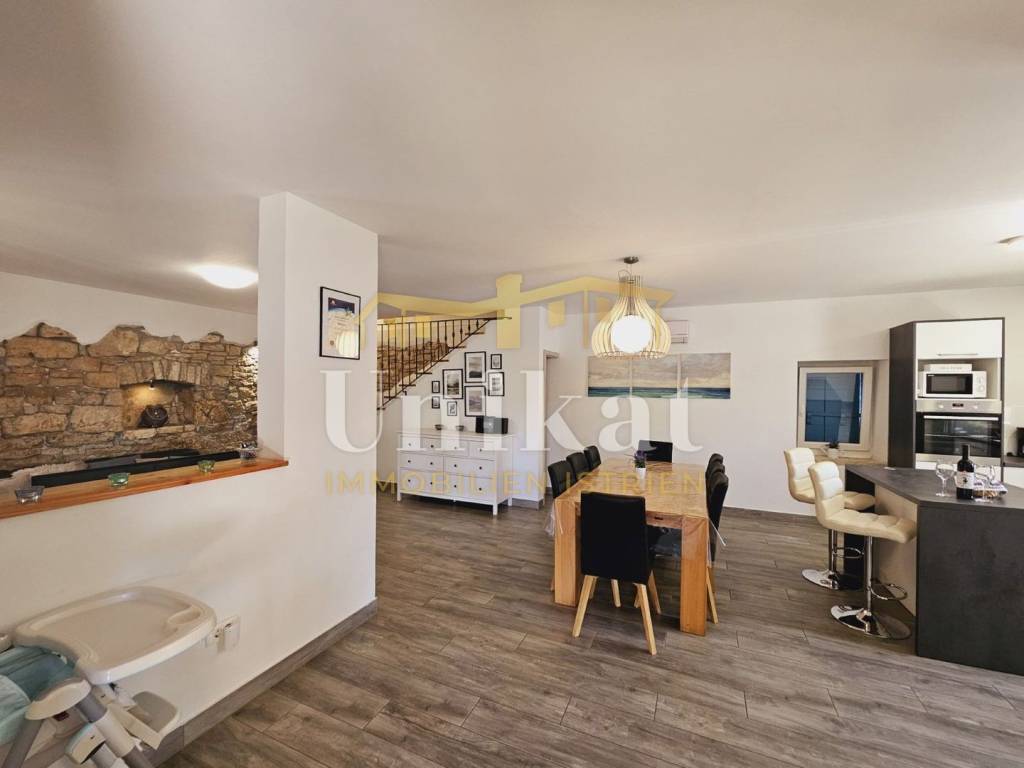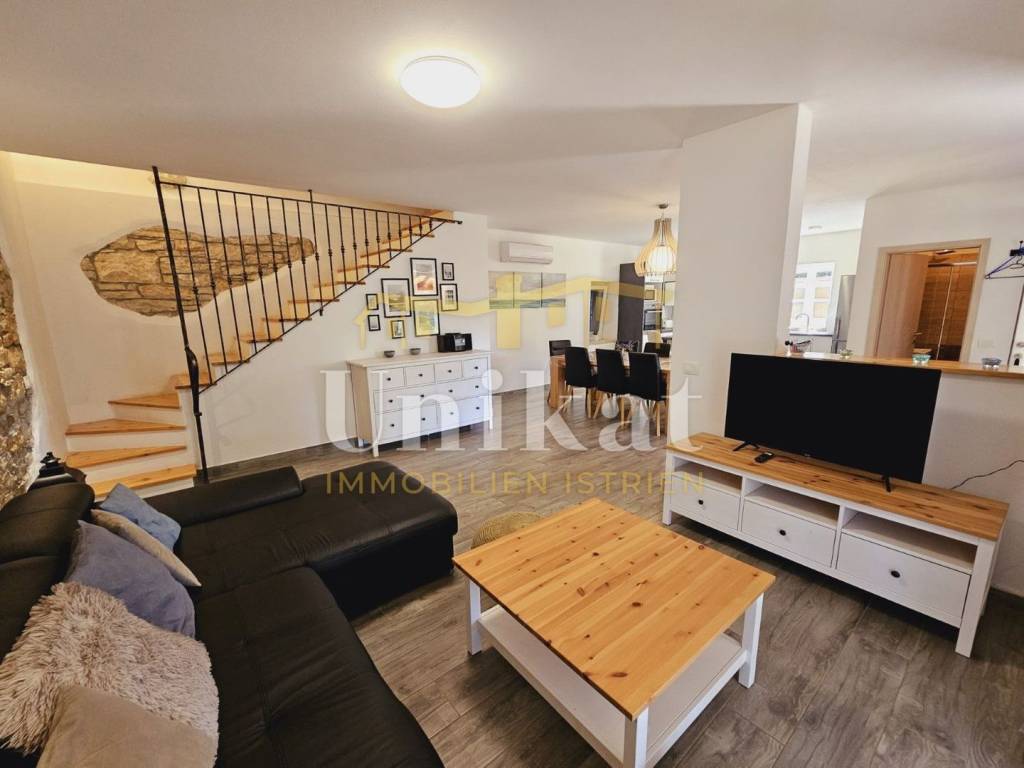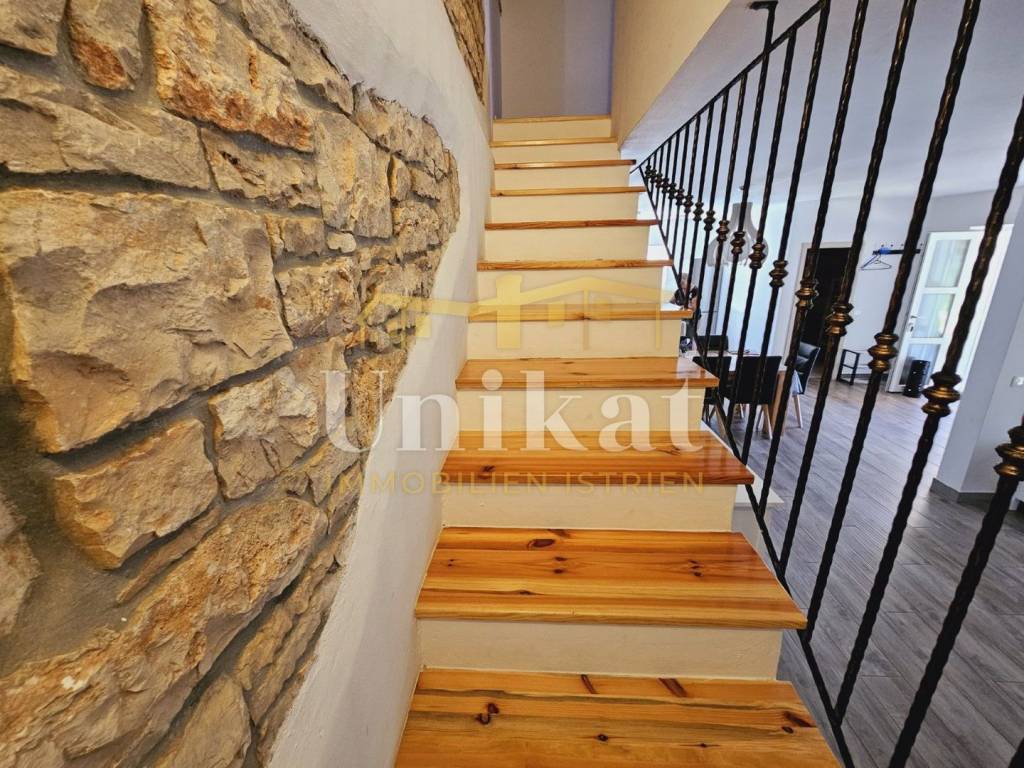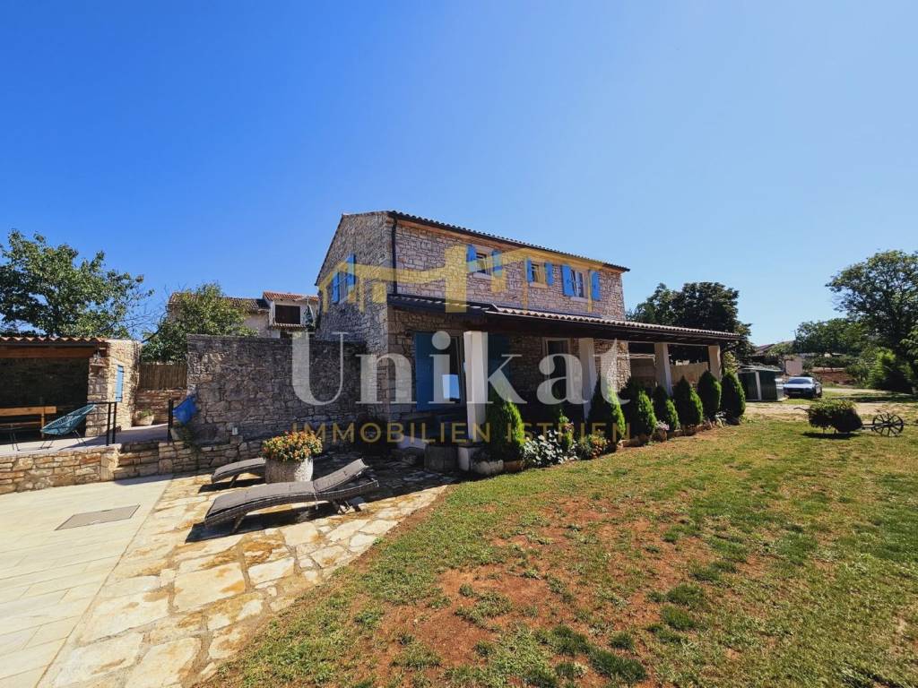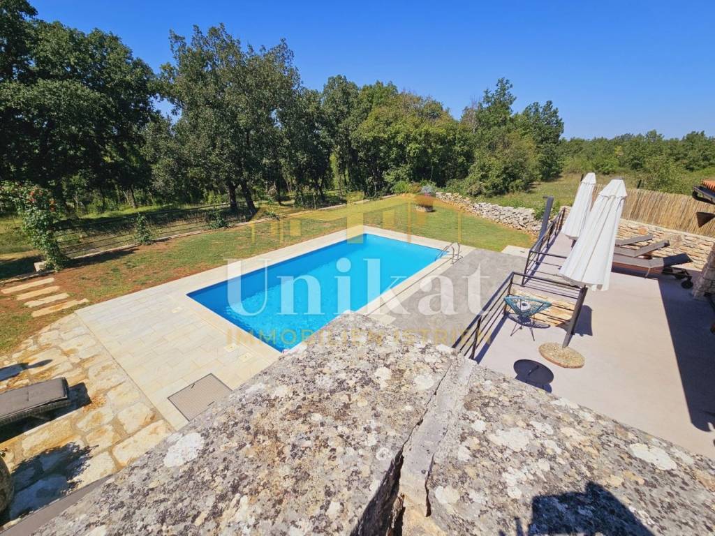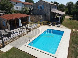 A stone house with a pool and large agricultural land is for sale in a quiet location surrounded by nature, 11 km from the sea and 15 km from the town of Poreč. The house is nicely renovated with a living area of 130 m2, divided into an upper floor and ground floor, plus a spacious covered terrace of 33 m2 on the ground floor.