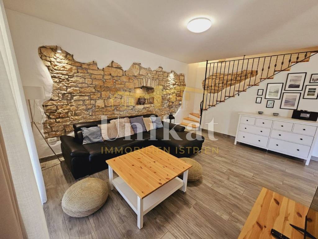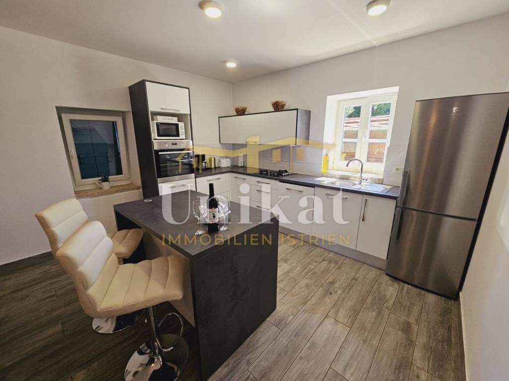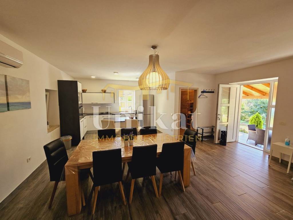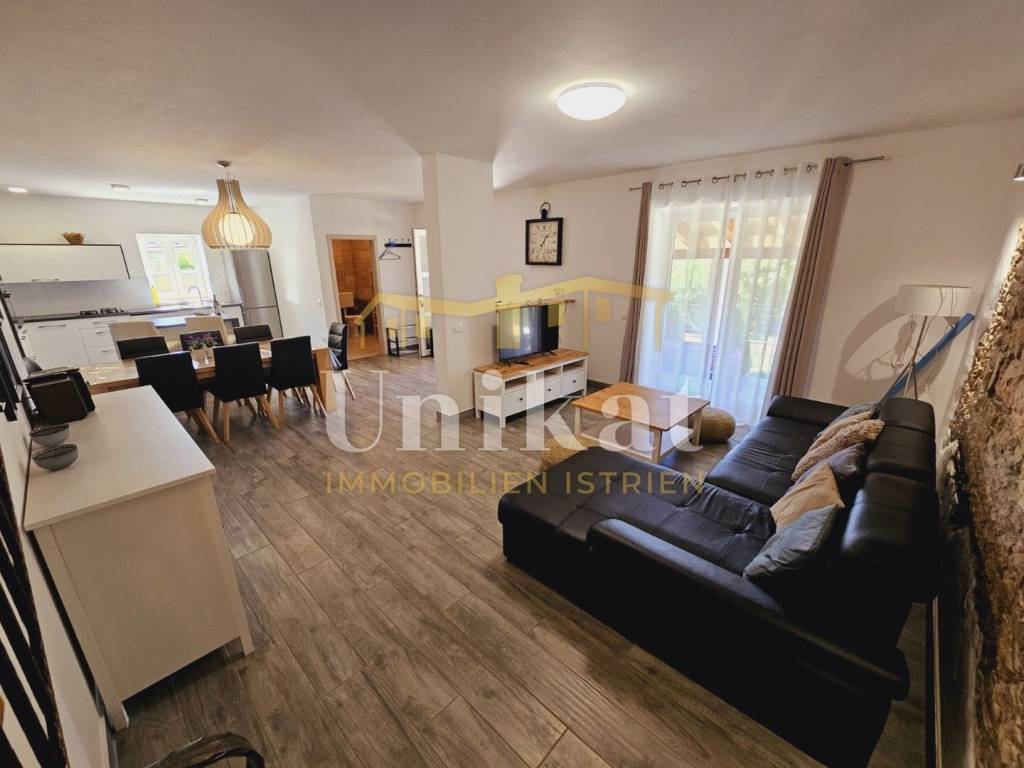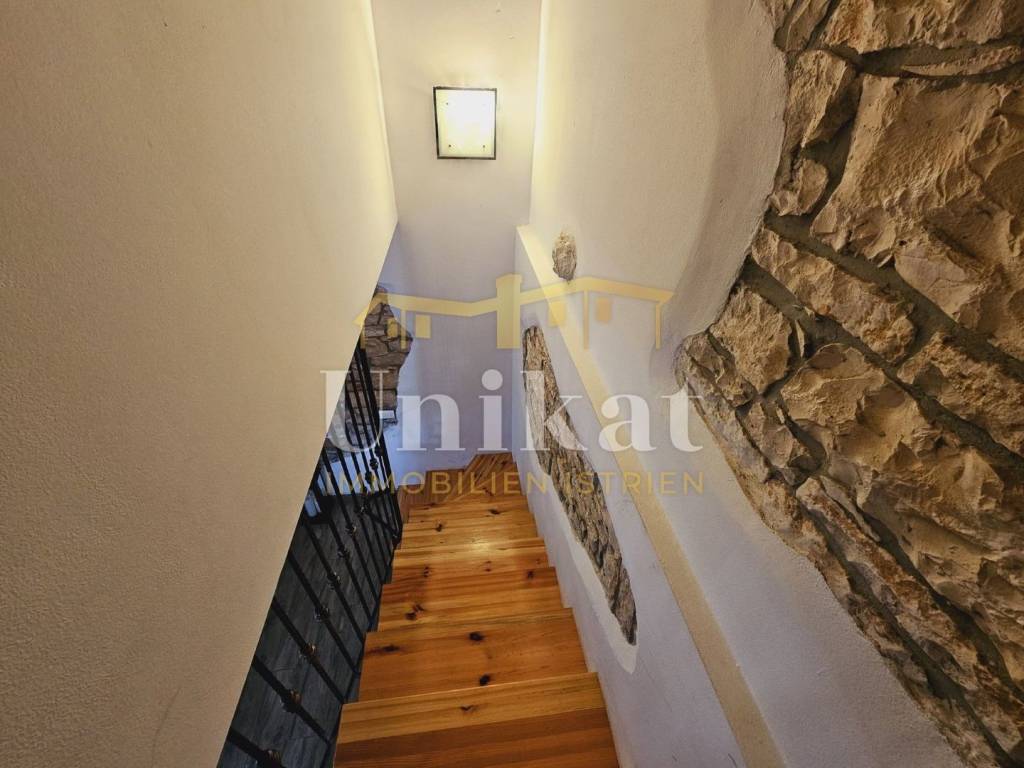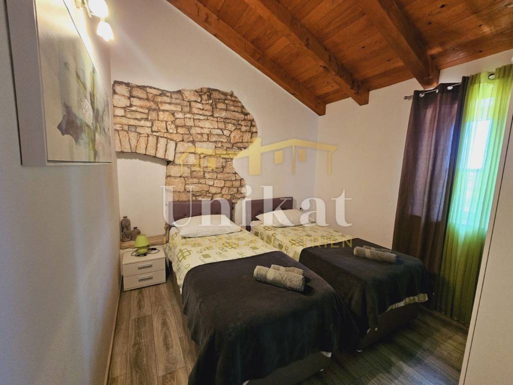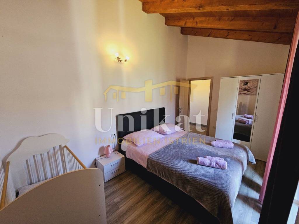 A stone house with a pool and large agricultural land is for sale in a quiet location surrounded by nature, 11 km from the sea and 15 km from the town of Poreč. The house is nicely renovated with a living area of 130 m2, divided into an upper floor and ground floor, plus a spacious covered terrace of 33 m2 on the ground floor.