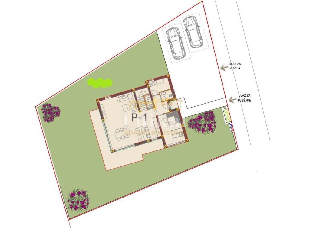 In front of the house, there is parking for two to three vehicles, and behind the house, there is a pool with a sunbathing area. The rest of the plot is arranged as a garden with lawn and ornamental plants. The entire land is fenced.