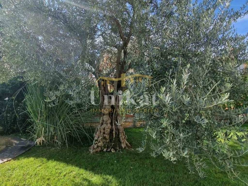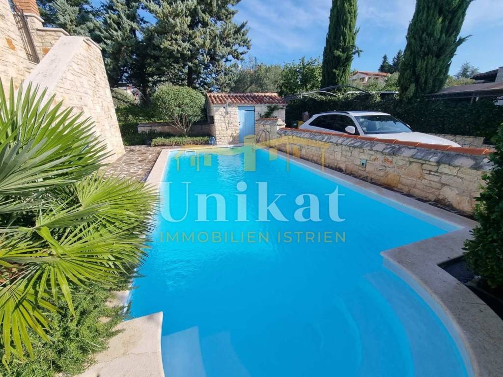Outside there is a garden arranged in Mediterranean style and a 30 m2 swimming pool. Next to the pool there is a small stone house that serves as an auxiliary room and could be converted into a sauna or similar. Additionally, the garden includes a summer kitchen and an outdoor shower. Two parking spaces are arranged, and the entire land is fenced.