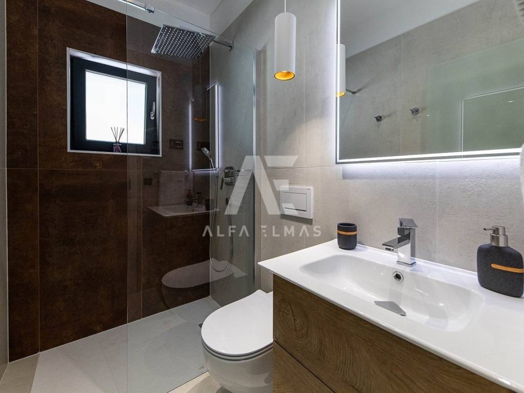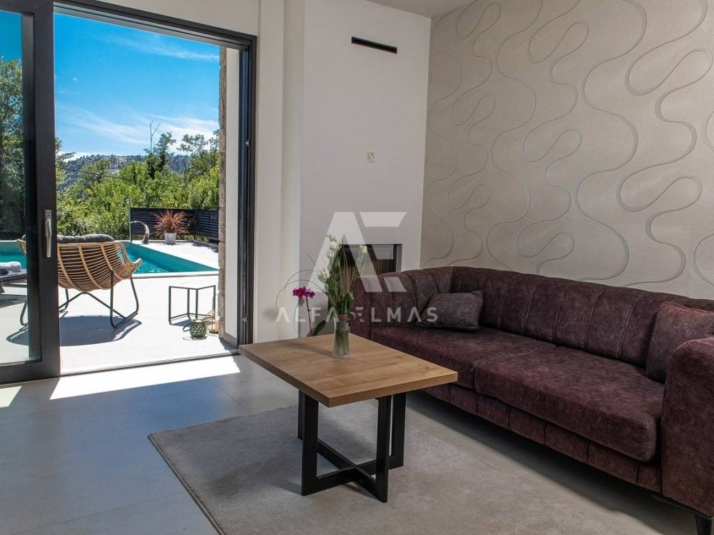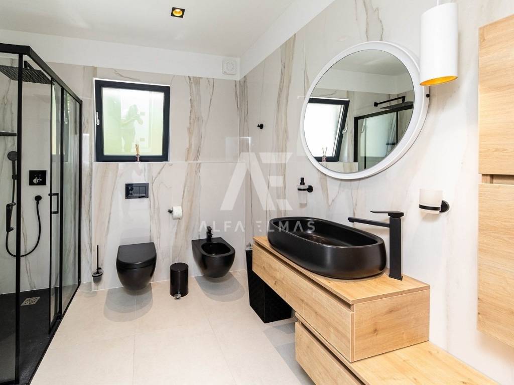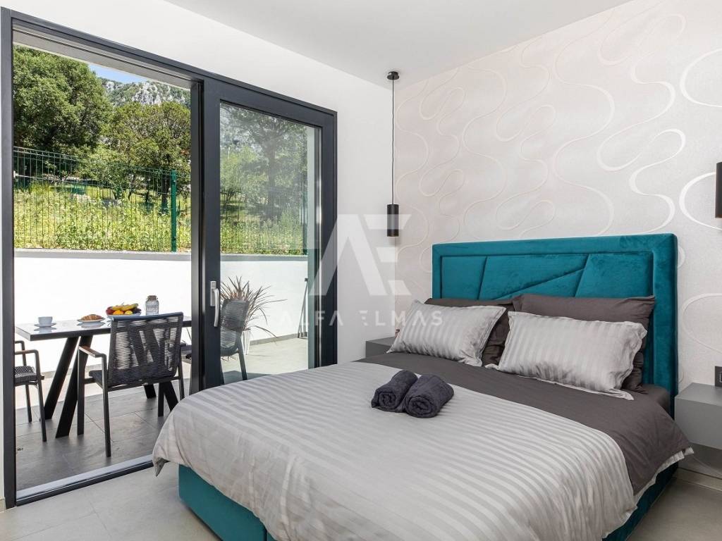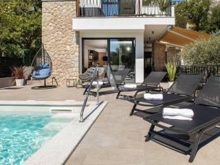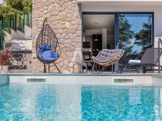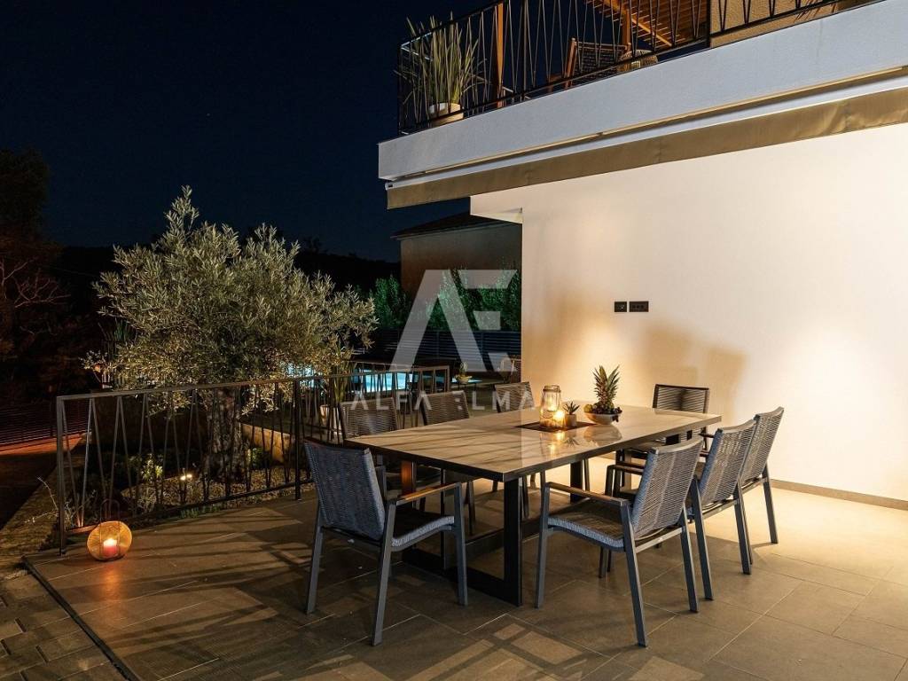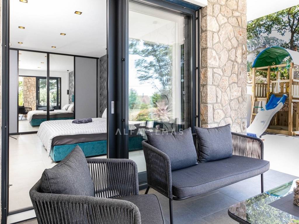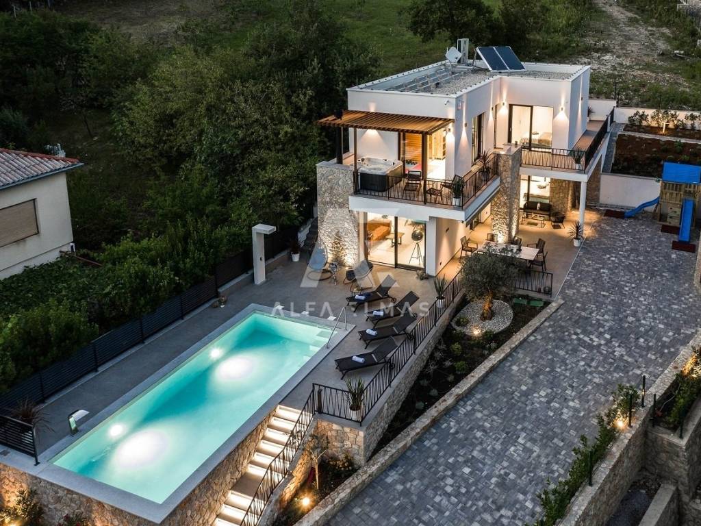 Crikvenica, surroundings, luxury villa with pool in a quiet location!! The extremely luxurious and modernly decorated "smart house" is located just a few kilometers from the Crikvenica Riviera. The view of the sea extends from the spacious terrace of the house. The villa in a quiet location has a ground floor and a first floor, built in 2020. On the ground floor of the luxurious villa there is a spacious hallway, a bathroom, a utility room with a washing machine and dryer and a machine room, a large bedroom, a spacious living room with a kitchen and a dining room, and panoramic openings to a large terrace that stretches along the sun deck of the pool. In the immediate vicinity there is also a covered terrace for barbecue. The ground floor is connected by an internal staircase to the first floor where there are three beautiful and spacious bedrooms with two bathrooms and a sauna and wellness unit. All rooms have access to terraces, and on the south side there is a beautiful view of the sea!! There is also a jacuzzi on the southern terrace. The equipment of the luxury villa is more than excellent. Aluminum external carpentry with electric external blinds, heating and cooling are fully automated, the villa is equipped with a central vacuum system, the bathrooms are equipped with high-quality ceramics and sanitary ware, the house is equipped with an alarm and anti-burglary system, preparations for photovoltaic cells have also been carried out, in short, the villa is fully prepared for self-sustaining use. The electrical installations in the luxury villa are made according to the "smart house" system, all functions can be controlled by mobile phone, from the external access sliding fence to the burglar-proof entrance door, complete lighting and shading, etc. The garden and grounds of the villa in the vicinity of Crikvenica are extremely beautifully decorated. in Mediterranean style, implemented irrigation system, outdoor solar shower, beautiful and large heated swimming pool with waterfall, parking spaces for four cars with charging station for electric motor vehicles.