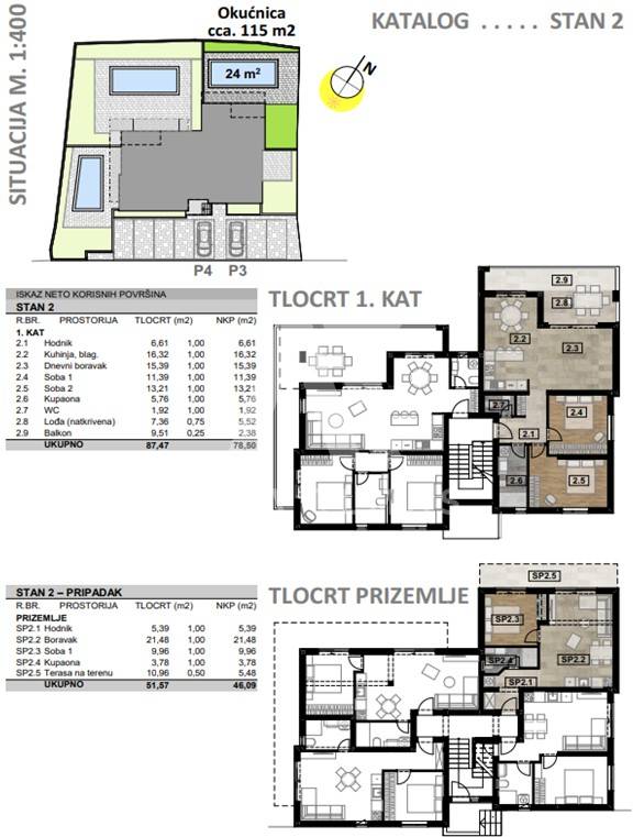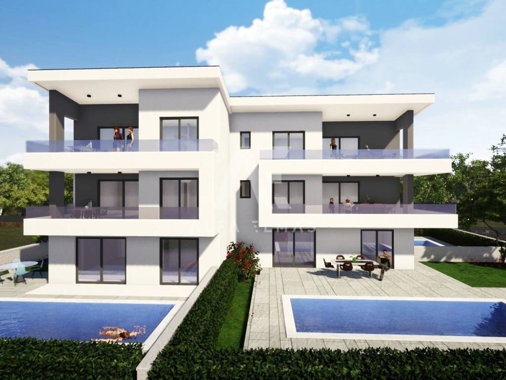 Malinska, surroundings, newly built two-room apartment on the first floor, living area of ​​78.50 m2 with swimming pool and garden. A two-room apartment in a quiet location only 1.5 km from the center of Malinska, whose completion is expected in the summer of 2024, consists of an entrance hall, bathroom, two bedrooms, toilet, kitchen, dining room and living room, from which there is an exit to covered balcony. The two-room apartment on the ground floor of the residential building also includes a smaller one-room apartment of 46.09 m2, which consists of one bedroom, bathroom, living room, dining room and kitchen, from which there is an exit to the garden of 115 m2 with a swimming pool and a sun deck. The apartment will be equipped with first-class ceramic tiles, first-class sanitary facilities, an air-conditioned heating and cooling system, electric underfloor heating and blinds with mosquito nets. The apartment has parking for two vehicles. The documentation is in order.