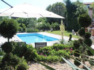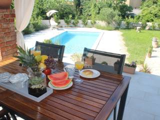 The house consists of an entrance hall, a bathroom, a kitchen and a living room with a dining room on the ground floor, and two bedrooms, a bathroom and an open terrace on the first floor. From the ground floor there is also an exit to the terrace, which is completely covered, which makes it possible to stay outdoors in various weather conditions. A terrace with a stapa with a landscaped garden enriched with Mediterranean plants and equipped with an irrigation system. In addition to the 8m X 4m swimming pool with counter-current swimming, there is also a stone-lined tool shed and brick barbecue and parking for two cars.
