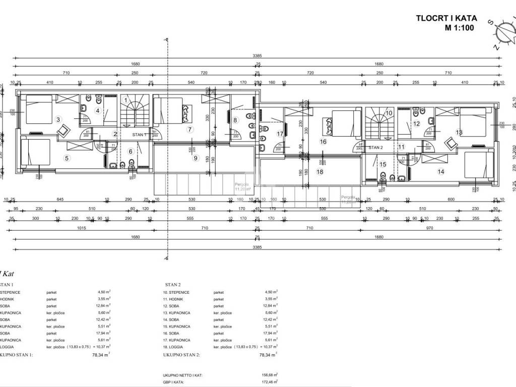 The net residential area is 157.48 m2 spread over two floors. On the ground floor of the house there is a spacious living room with large openings that allow access to the loggia and a sun deck by the pool (10x4m), the living room is connected to the kitchen and dining room, on the ground floor there is also a bedroom with an en suite bathroom, a laundry room, a wellness room with sauna and built-in shower. Upstairs there are a total of three bedrooms with three en suite bathrooms. There is a view of the sea from the garden and from the first floor. There are two parking spaces in the building's garden. Exclusive and modern real estate with numerous amenities, suitable for tourism! Documentation in order!