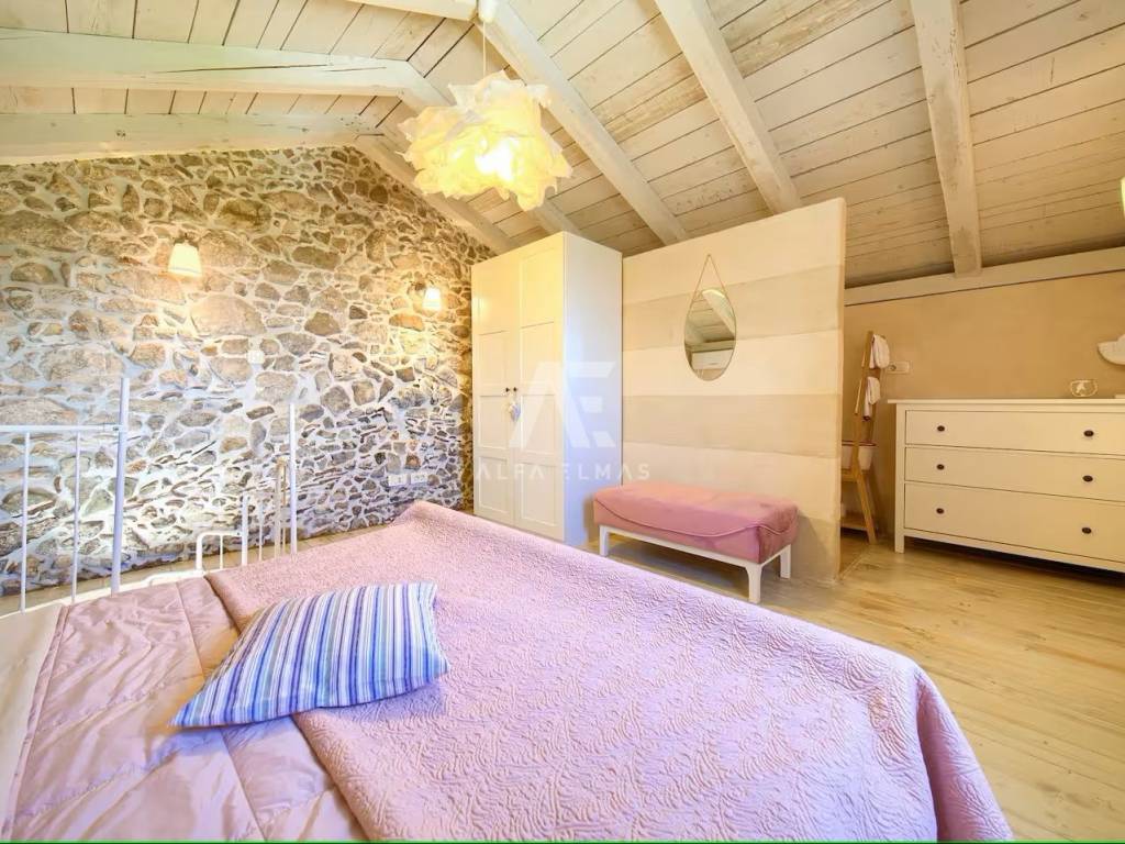 The house has a living area of ​​80m2 and has a ground floor and two floors. On the ground floor there is a living room with access to the garden, a comfortable bedroom and a bathroom, the living room can be used as an additional bedroom if needed. On the first floor there is a kitchen and a dining room with access to a terrace with a beautiful view of the green belt. On the second floor there is a sleeping loft with an en suite bathroom and a view of the sea. An air conditioner with heating and cooling functions is installed on each floor, while the living room also has a wood-burning stove that provides a special atmosphere in the colder seasons.