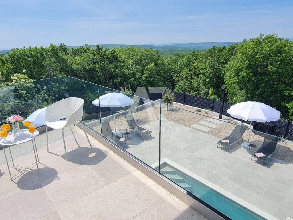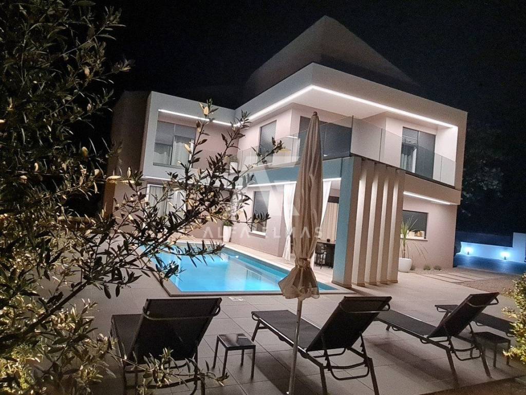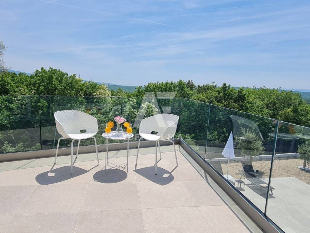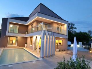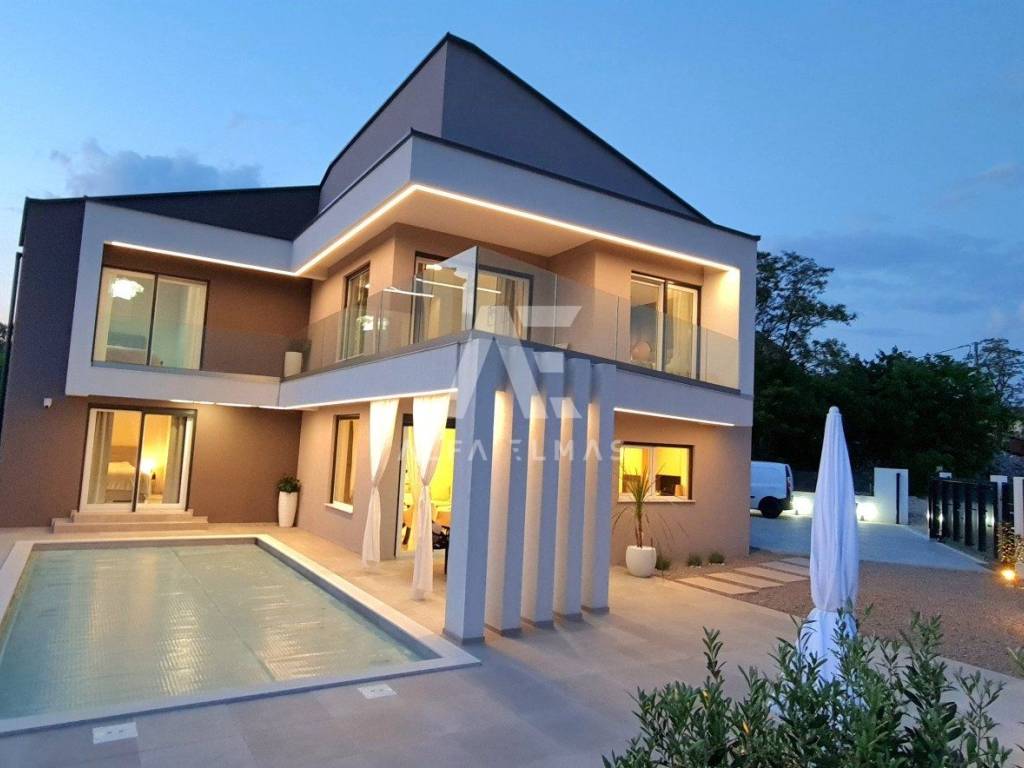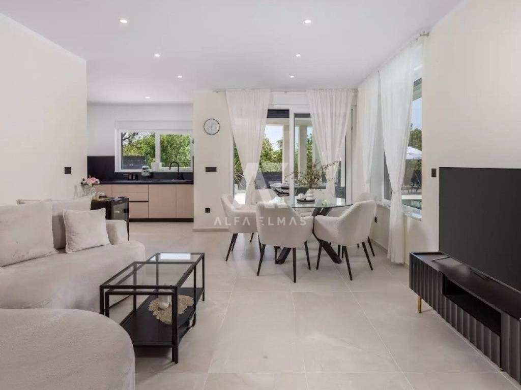 A beautiful modern villa with a swimming pool is for sale, situated on a 612 m² plot bordering a green zone. The location guarantees peace and privacy, while the sea and beautiful beaches are only six kilometres away.