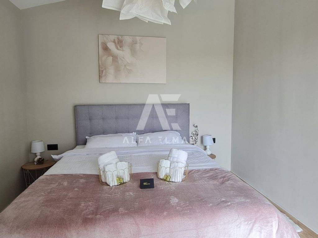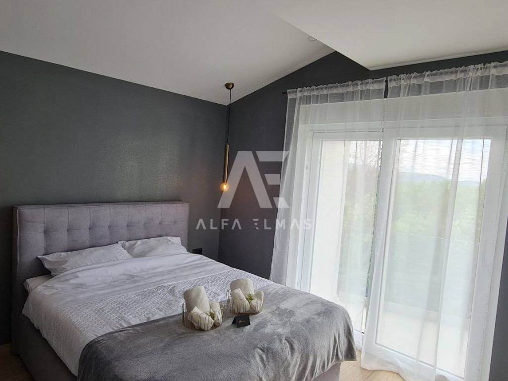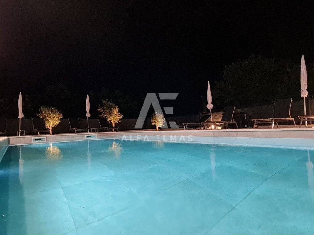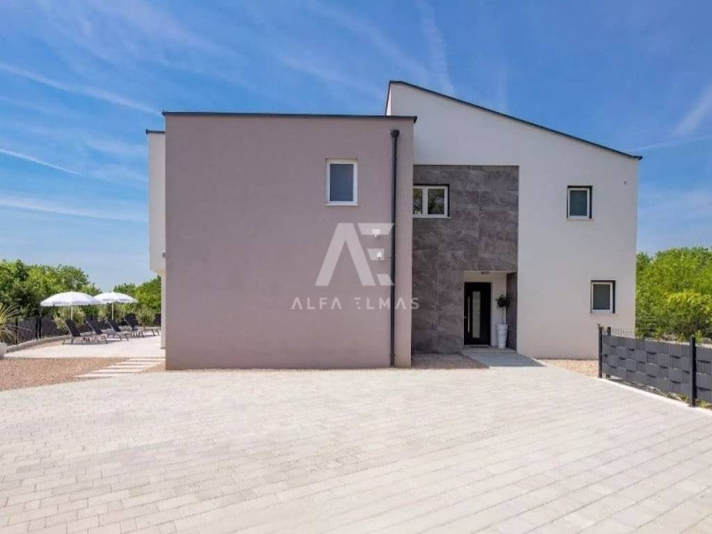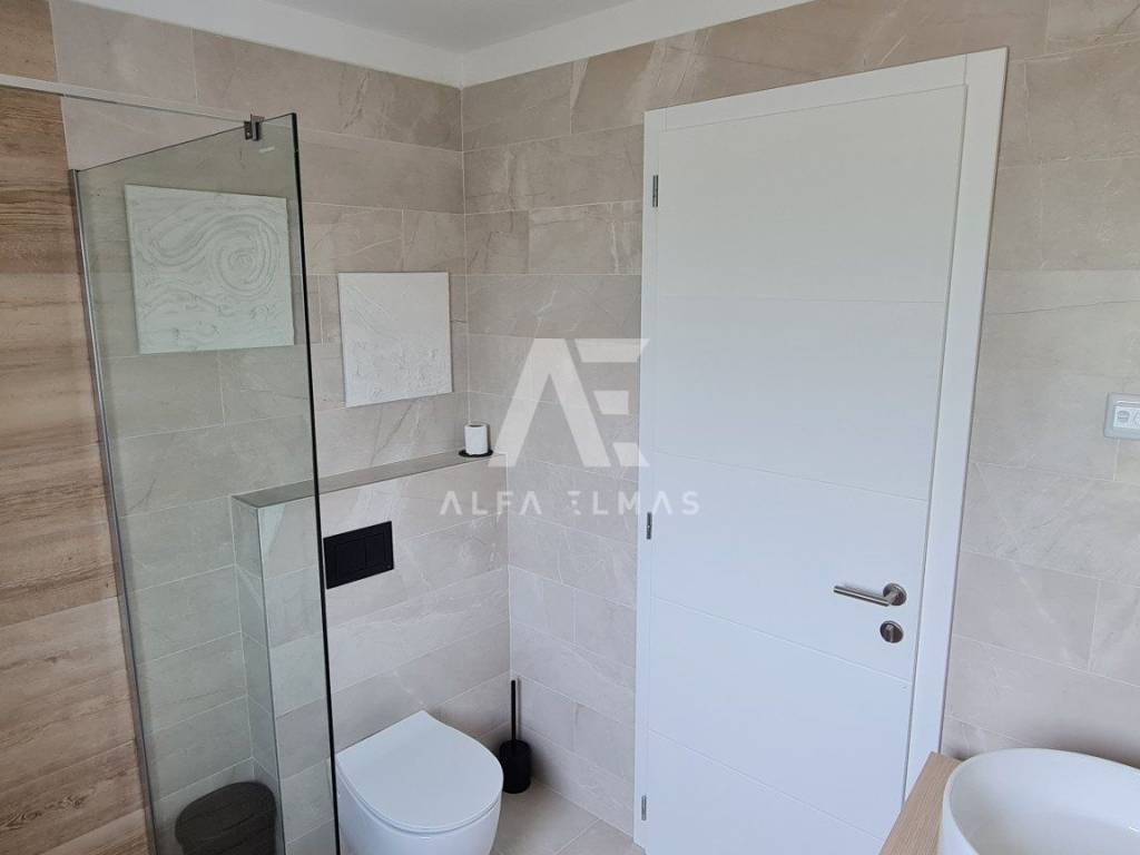 A beautiful modern villa with a swimming pool is for sale, situated on a 612 m² plot bordering a green zone. The location guarantees peace and privacy, while the sea and beautiful beaches are only six kilometres away.