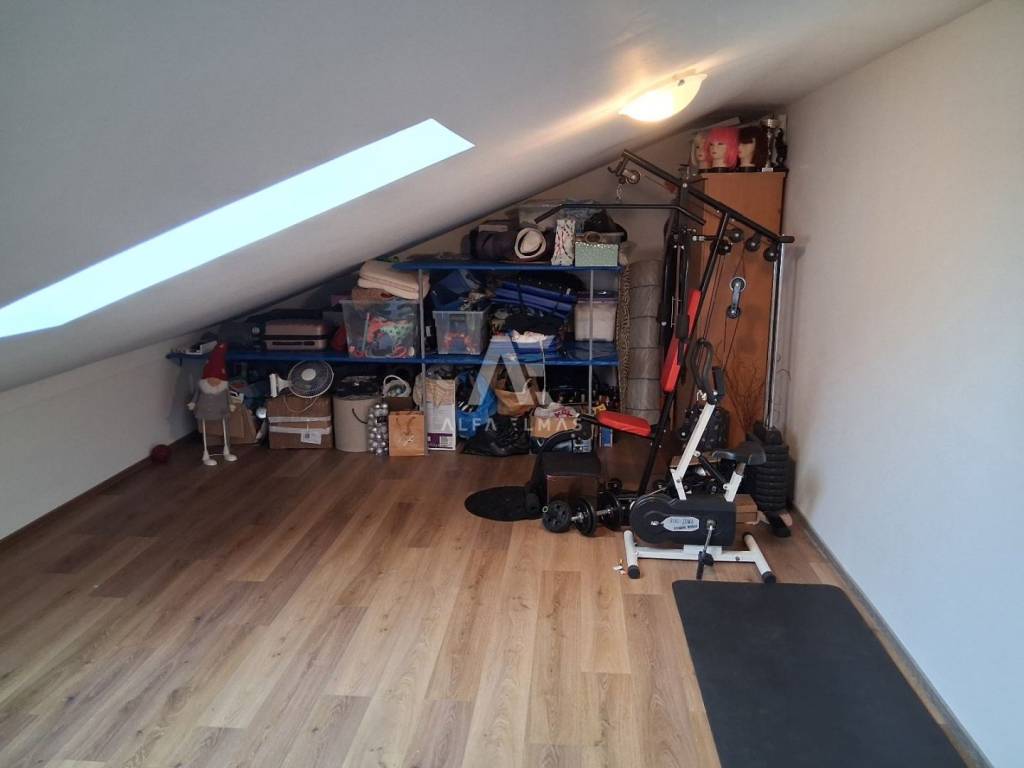 A spiral staircase leads to the upper floor – a high attic consisting of a third bedroom and a large, bright room that can serve as an additional bedroom, living room, playroom, workspace, or even an extra kitchen or bathroom, as water and drainage installations were pre-prepared during construction.
