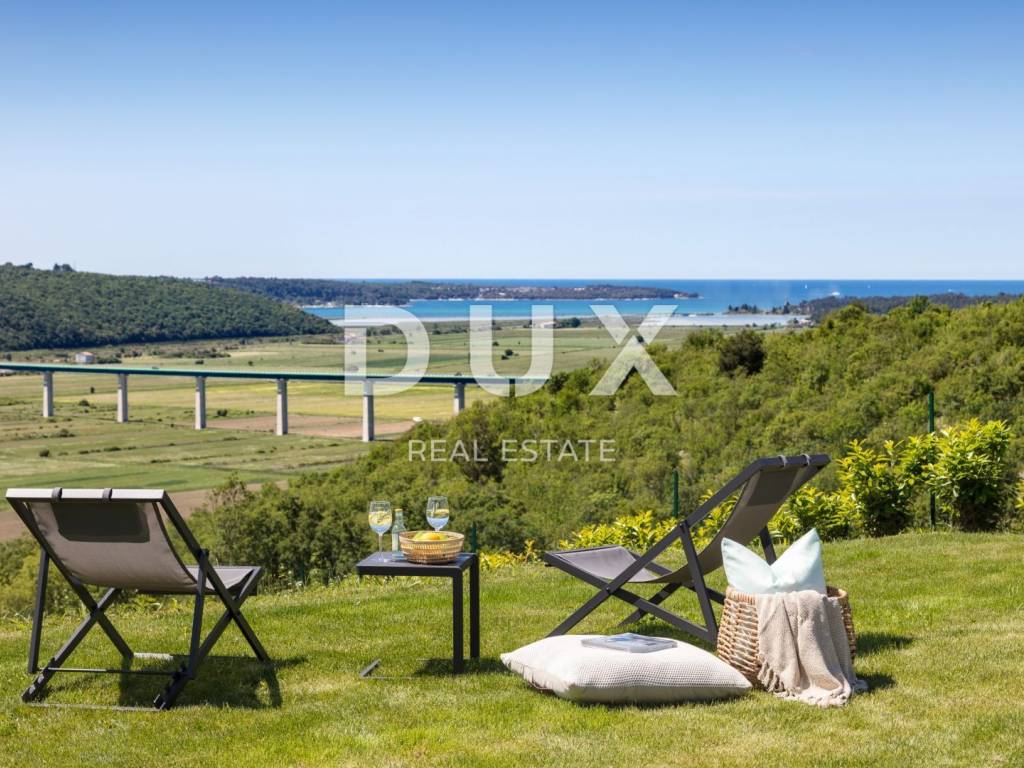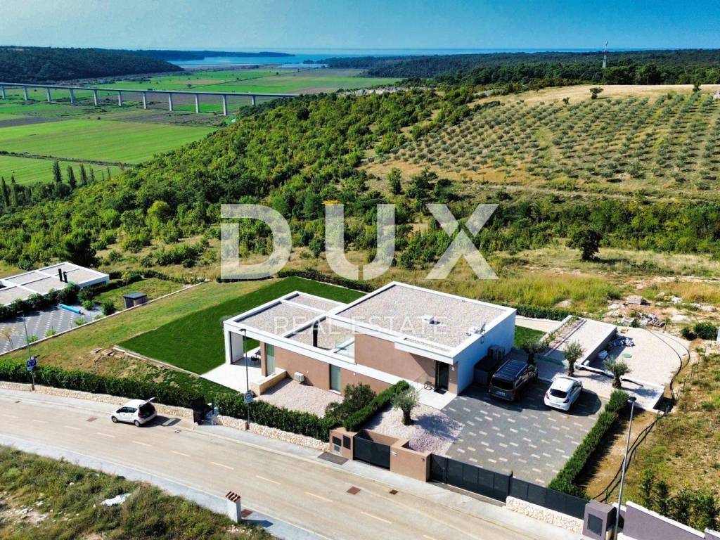 Just a few minutes' drive from the town of Novigrad, the sea and beautiful beaches, located in an exceptionally quiet location, is this modern villa with a panoramic view of the sea and the Mirna River valley.