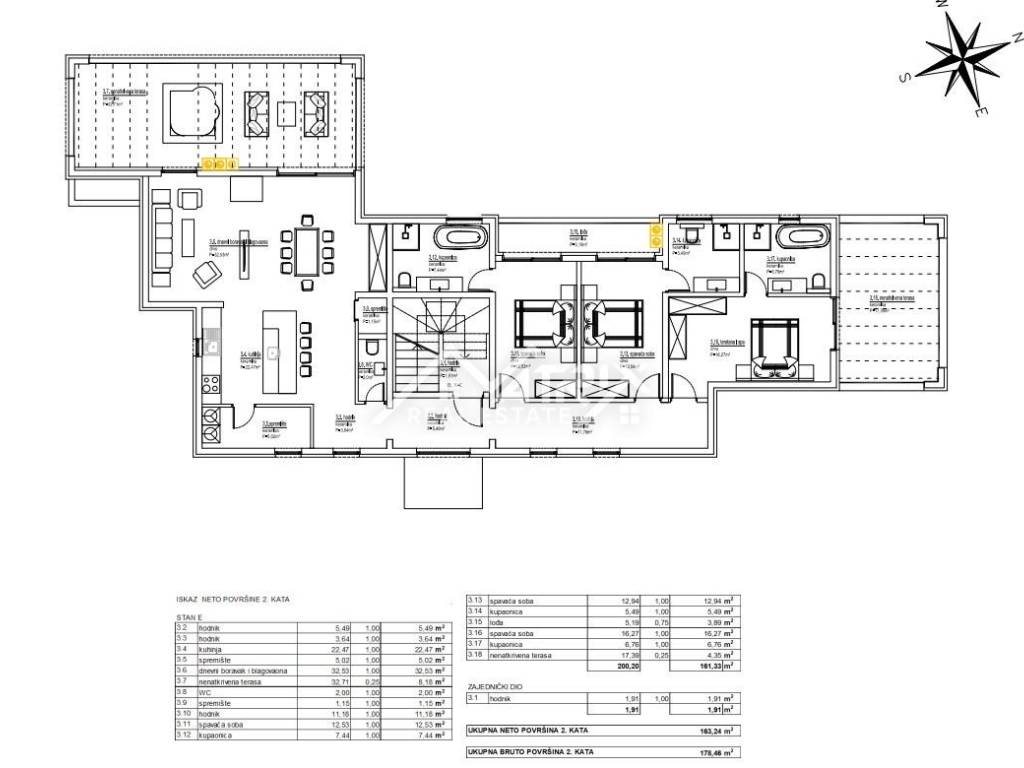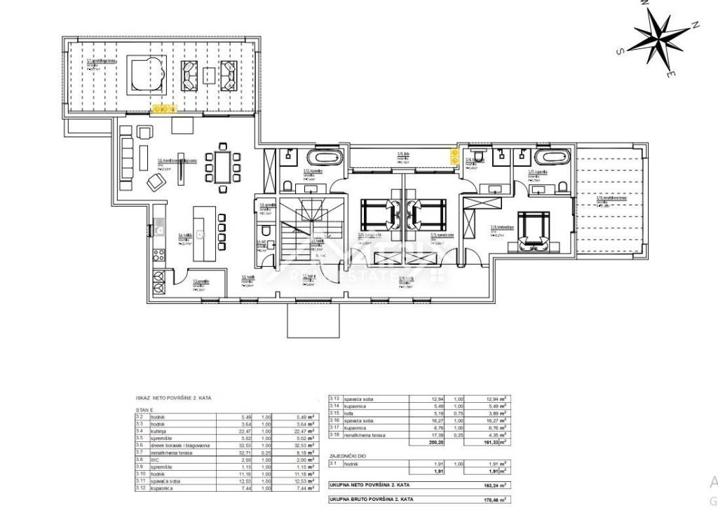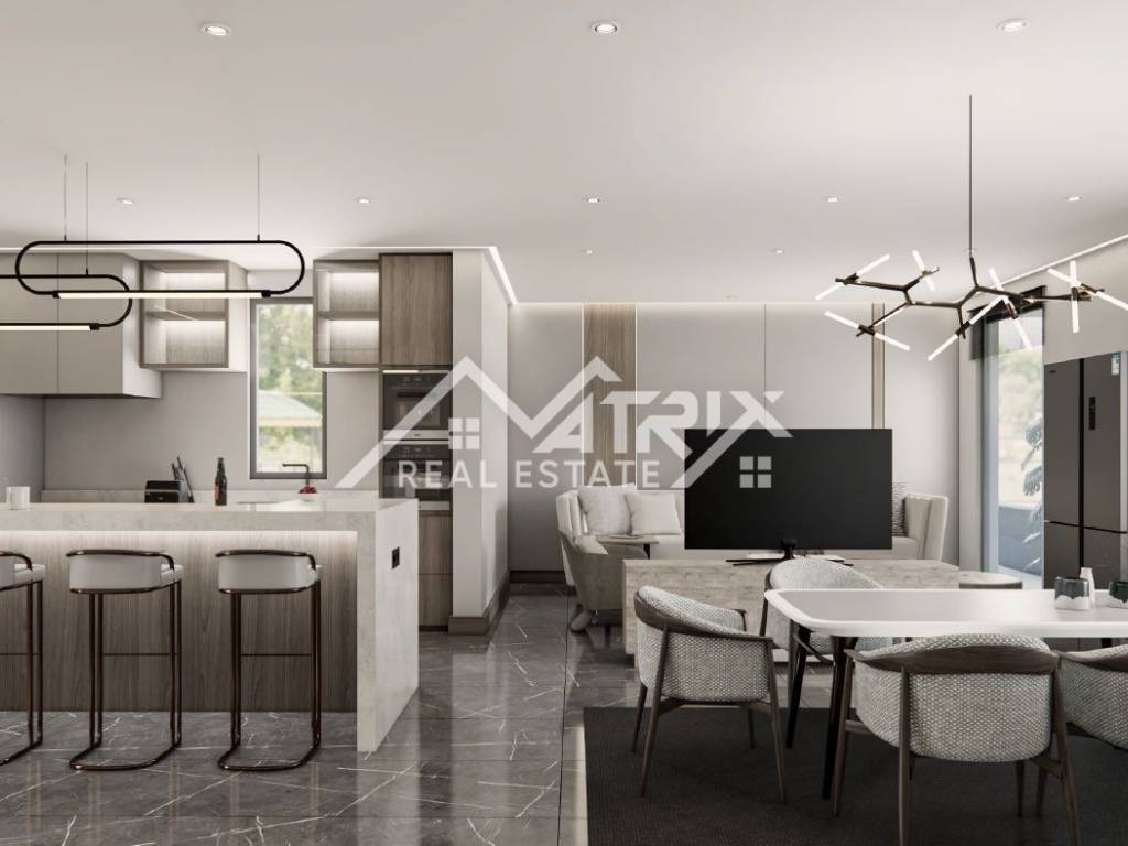 In close proximity to the sea and the city, a penthouse is for sale in a residential building with five units. The penthouse offers 161 m² of living space, and with a 33 m² terrace and a 3 m² balcony, the total area amounts to 200 m². Situated on the second floor, it comprises a spacious living room, a kitchen, and a dining area in an open space concept, three comfortable bedrooms, three luxurious bathrooms, and an additional WC.