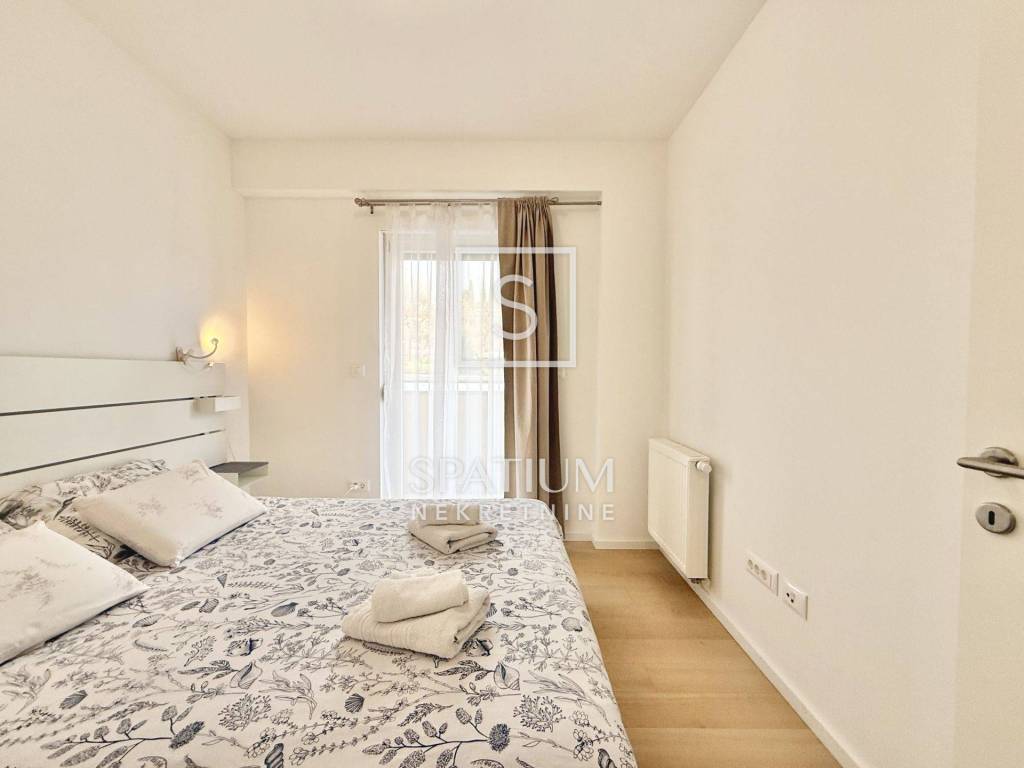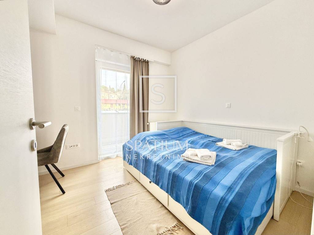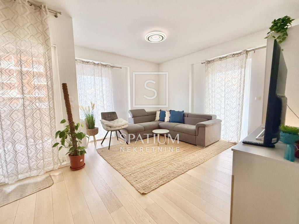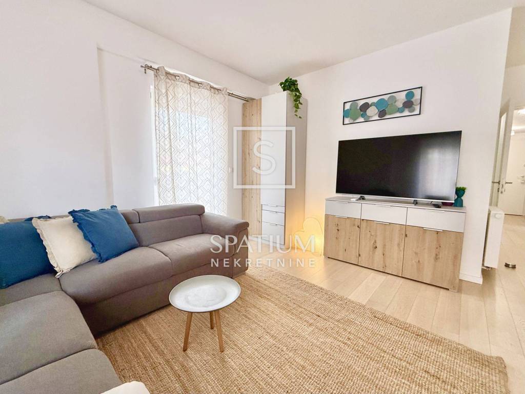 KANTRIDA, we have an excellent apartment in a new building, fully furnished and ready to move into, with an area of 77 m2. It consists of a living room, kitchen with dining area, two bedrooms (one in the children's room), bathroom, toilet and hallway. The living room opens onto a spacious and sunny balcony with a view of the sea and Rijeka. The apartment also has its own parking space and a storage room in the building. The heating is central gas, and the cooling is air conditioning. The apartment is ideal for family life, but also for tourism, since it is located near all necessary facilities (shops, public transport, schools, kindergartens, ...), only 500 meters from the first beach.