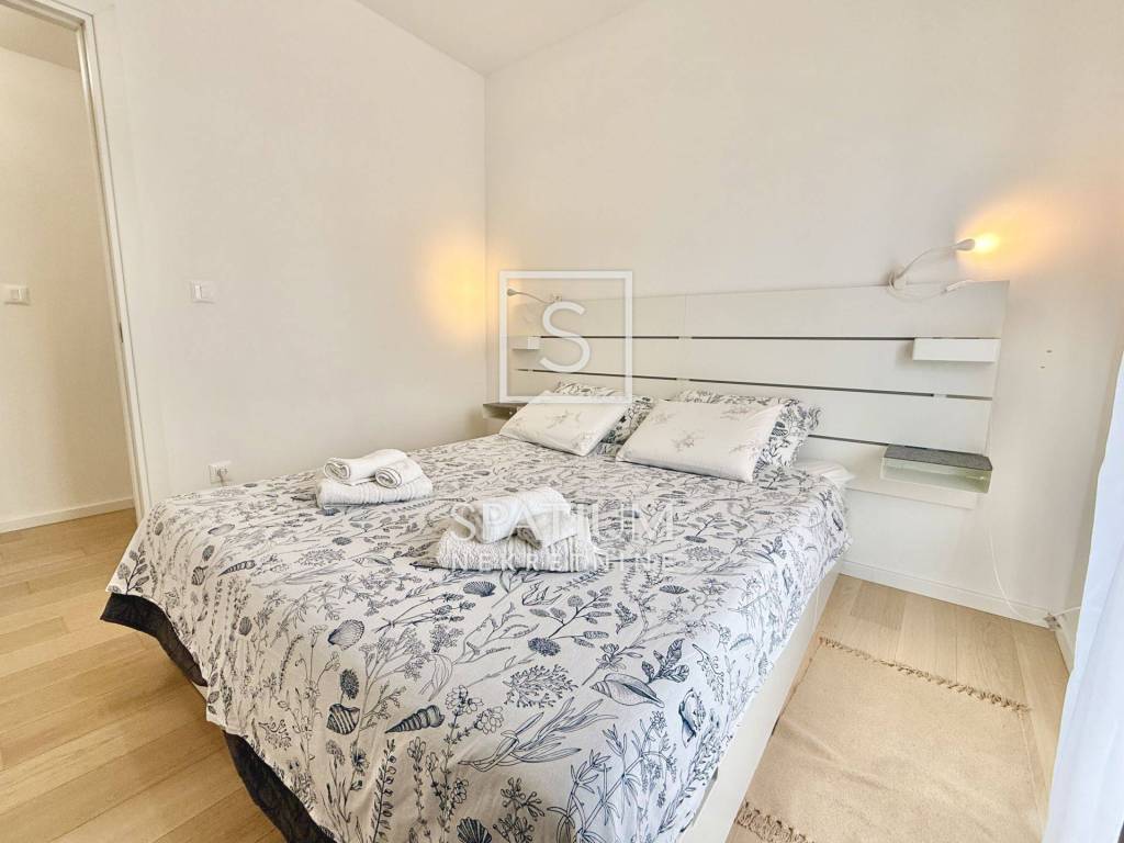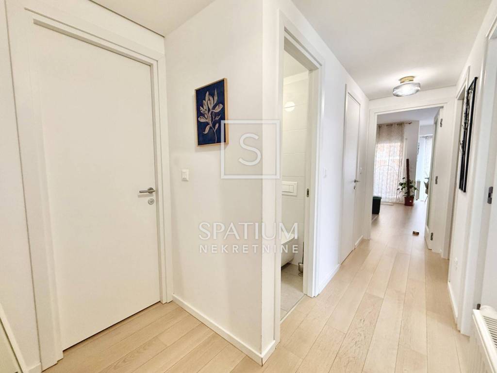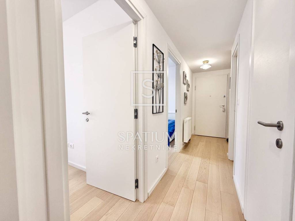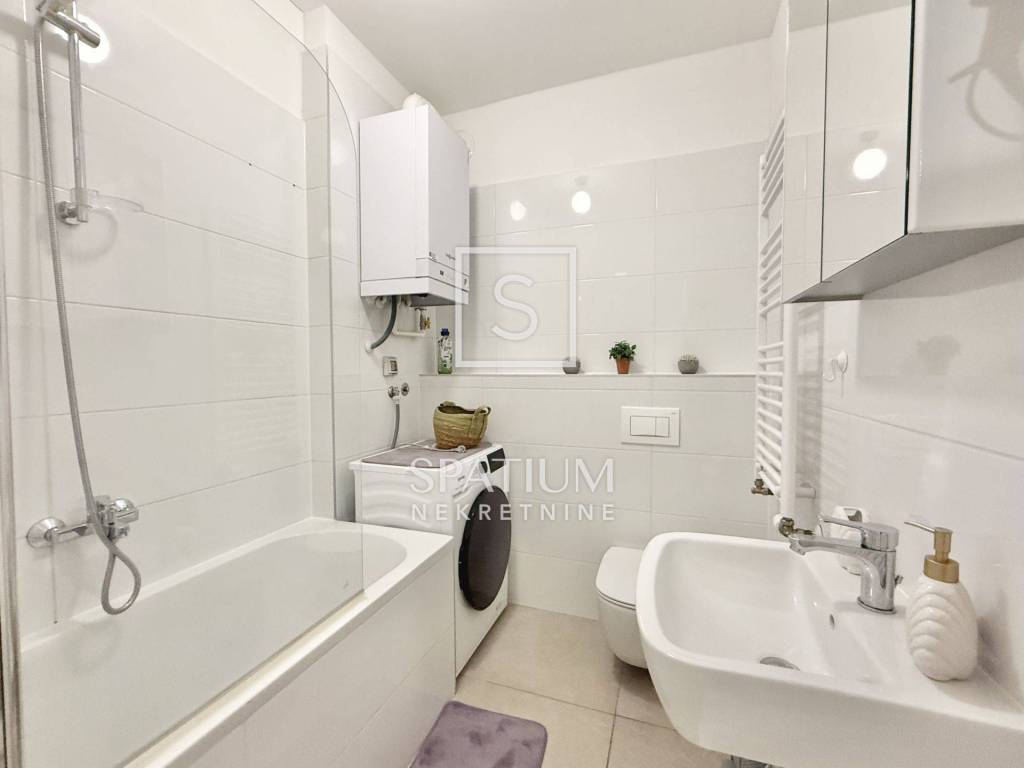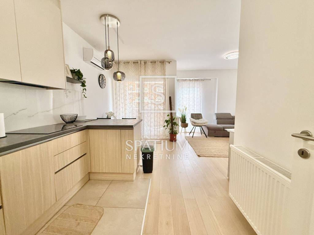 KANTRIDA, we have an excellent apartment in a new building, fully furnished and ready to move into, with an area of 77 m2. It consists of a living room, kitchen with dining area, two bedrooms (one in the children's room), bathroom, toilet and hallway. The living room opens onto a spacious and sunny balcony with a view of the sea and Rijeka. The apartment also has its own parking space and a storage room in the building. The heating is central gas, and the cooling is air conditioning. The apartment is ideal for family life, but also for tourism, since it is located near all necessary facilities (shops, public transport, schools, kindergartens, ...), only 500 meters from the first beach.