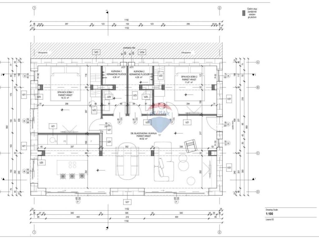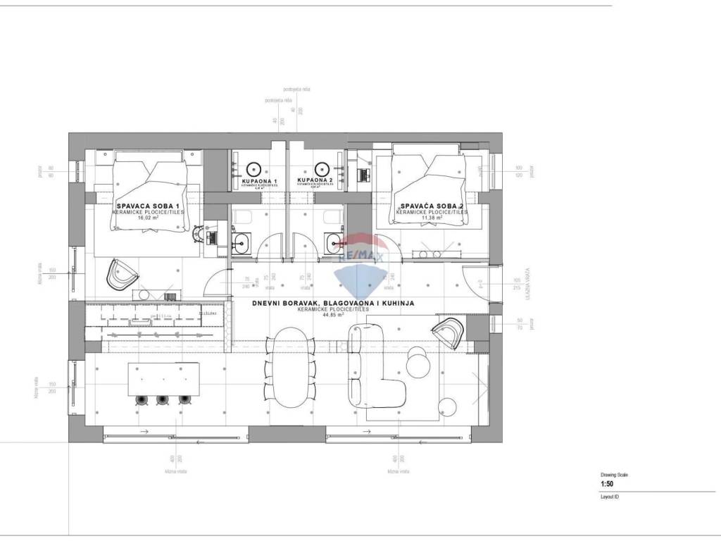 The apartment in question has a separate entrance, net living area of 81.29 m2, and consists of: 2 bedrooms, living room with kitchen and dining room and 2 bathrooms.