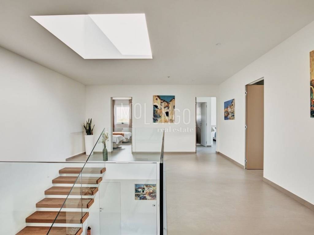 The sleeping part of the house is reached by modern stairs with wooden treads. Each of the 4 bedrooms has its own bathroom. Next to the bedrooms, there is a large laundry room on the first floor.