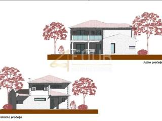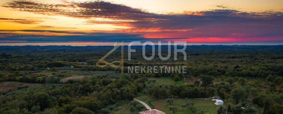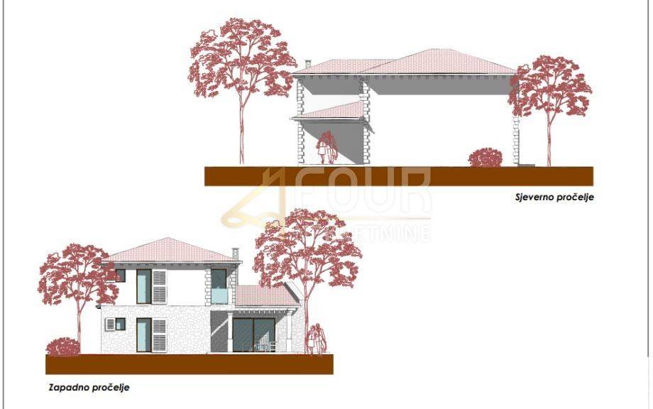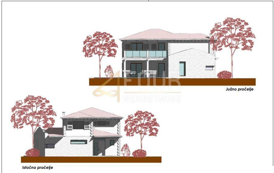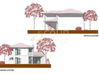 Building land for sale in a small village near Sveti Lovreč, with a beautiful sea view, area of 974m2 with a building permit, paid utility bills, and electricity and water connections on the site. According to the project, the construction of a house of approximately 170 m2 is planned, which will consist of a basement, ground floor and first floor (S+P+1). The ground floor includes a living room with dining room and kitchen, one bedroom with bathroom and an additional guest toilet, while the first floor will have two bedrooms, each with its own bathroom and terrace. An ideal opportunity to build a home or invest in an attractive location in Istria.