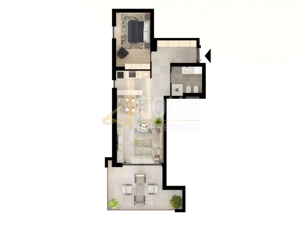 An apartment is on offer in a modern new building in Umag, just 350 meters from the sea. It is located on the 2. floor of one of four planned buildings, the completion of which is scheduled for the end of 2026. All buildings will have an elevator, which further contributes to the comfort of living. The apartment has a surface area of 68.80 m2, with an additional spacious terrace of 17.20 m2. The floor plan is designed as a one-bedroom apartment with a living room, and the living area with kitchen and dining room extends to as much as 34.10 m2. The bedroom has 12.10 m2, and the bathroom 5.20 m2. Thanks to its orientation to the east and west, it is extremely well lit by natural light throughout the day. It is equipped with underfloor heating and heat pumps for maximum energy efficiency. Possibility of purchasing a garage and/or outdoor parking space. An ideal opportunity for those looking for quality, comfort and proximity to the sea.