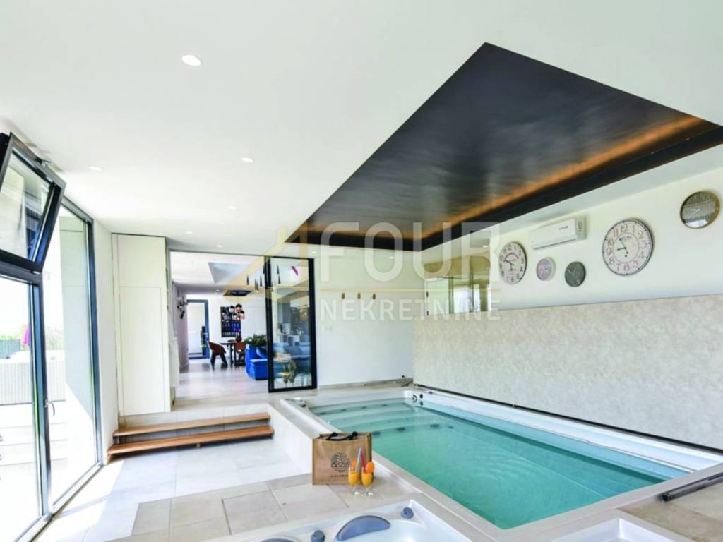The pool, with water heated up to 40 °C, is built using innovative technology and allows remote control. During summer, the large glass wall can be fully opened, creating the feeling of an outdoor pool with minimal maintenance costs.