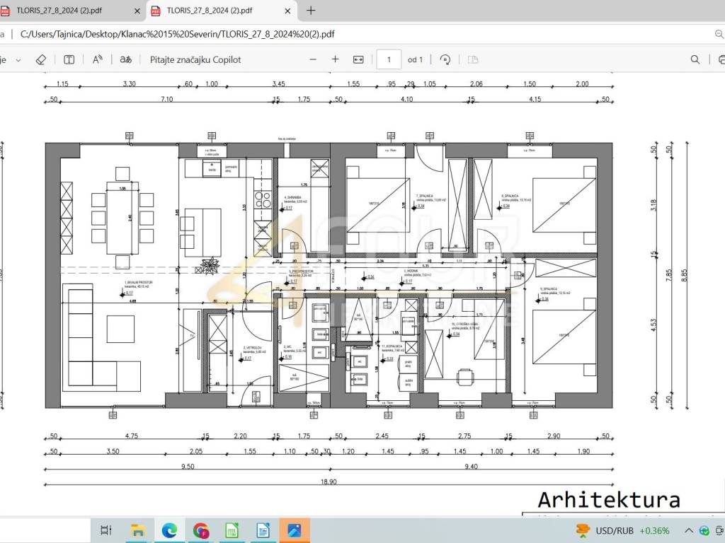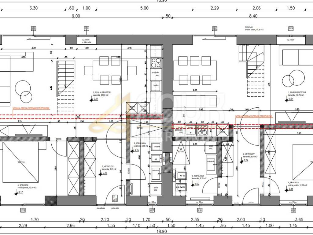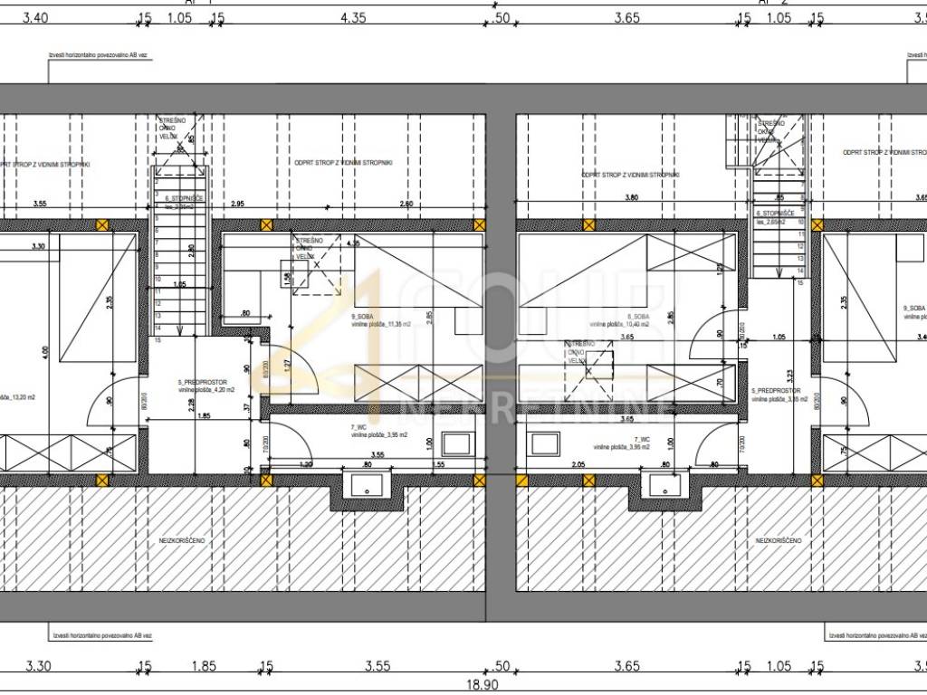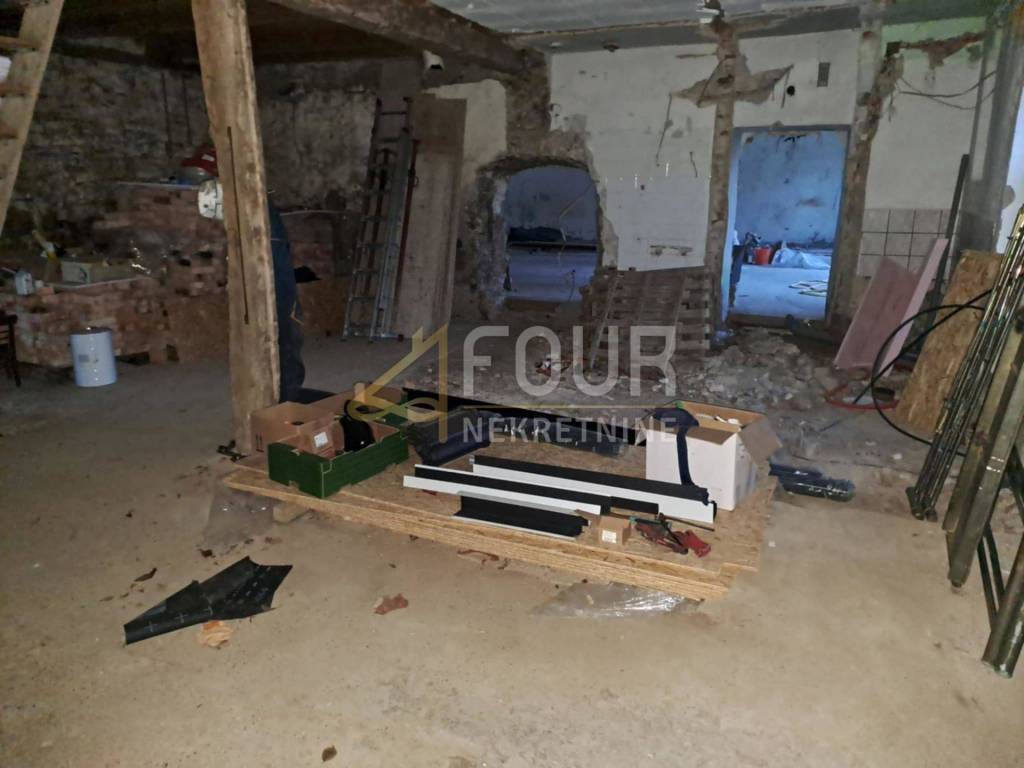 There is a conceptual project for a ground floor of 130.90 m2 with a tavern of 50 m2, or alternatively for two two-story apartments (ground floor and basement) with a total area of ​​199.15 m2.