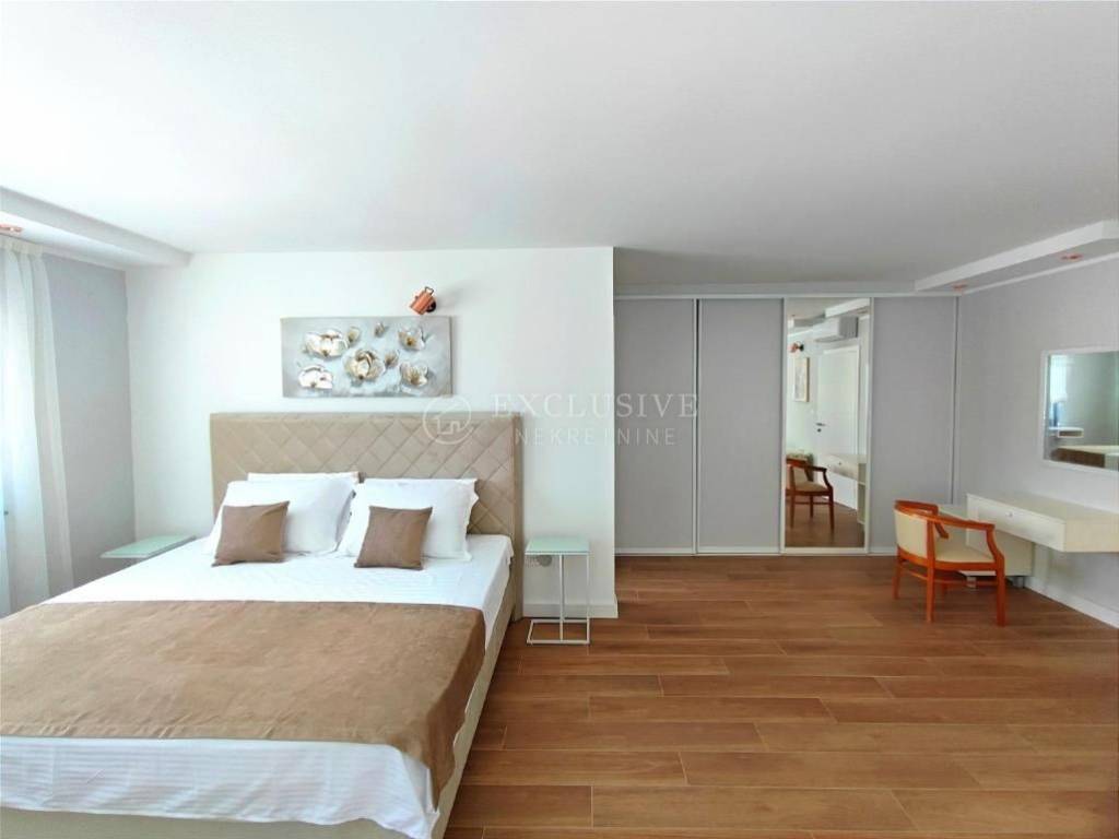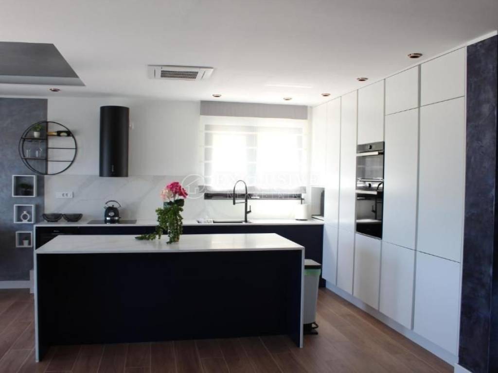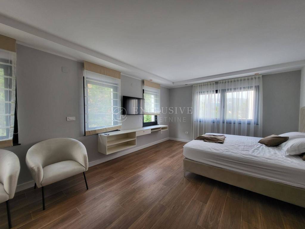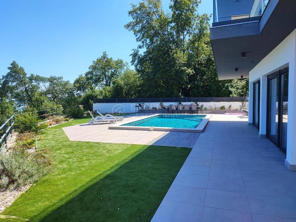 LOVRAN - for sale is a newly furnished modern house with a living area of 400m2 with a swimming pool and a panoramic view of the sea. The house is located in a quiet location, and consists of a total of 5 bedrooms, each with its own bathroom, and exit to the terrace. Underfloor heating is installed everywhere, and in the yard there is a large heated swimming pool located on a spacious sunbathing area. Beautifully fenced yard Security alarm system Luxury modern furniture Playroom for children Garage for two cars Large roof terrace with pergola 3 minutes by car to the center of Lovran. Ideal property for family life or as an investment for tourist rental.
