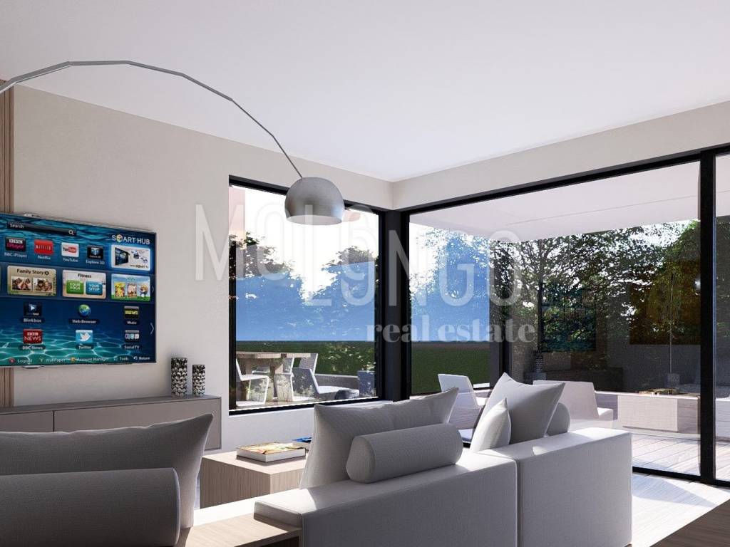 Living room with large windows and access to the covered terrace with southern orientation