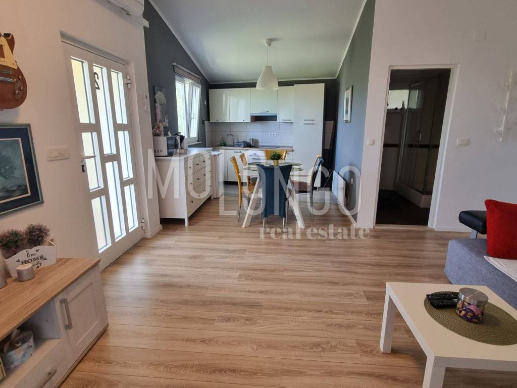 The ground floor apartment consists of a kitchen with access to a large covered terrace, a living room, two bedrooms, and a bathroom. There is also a storage room on the ground floor.