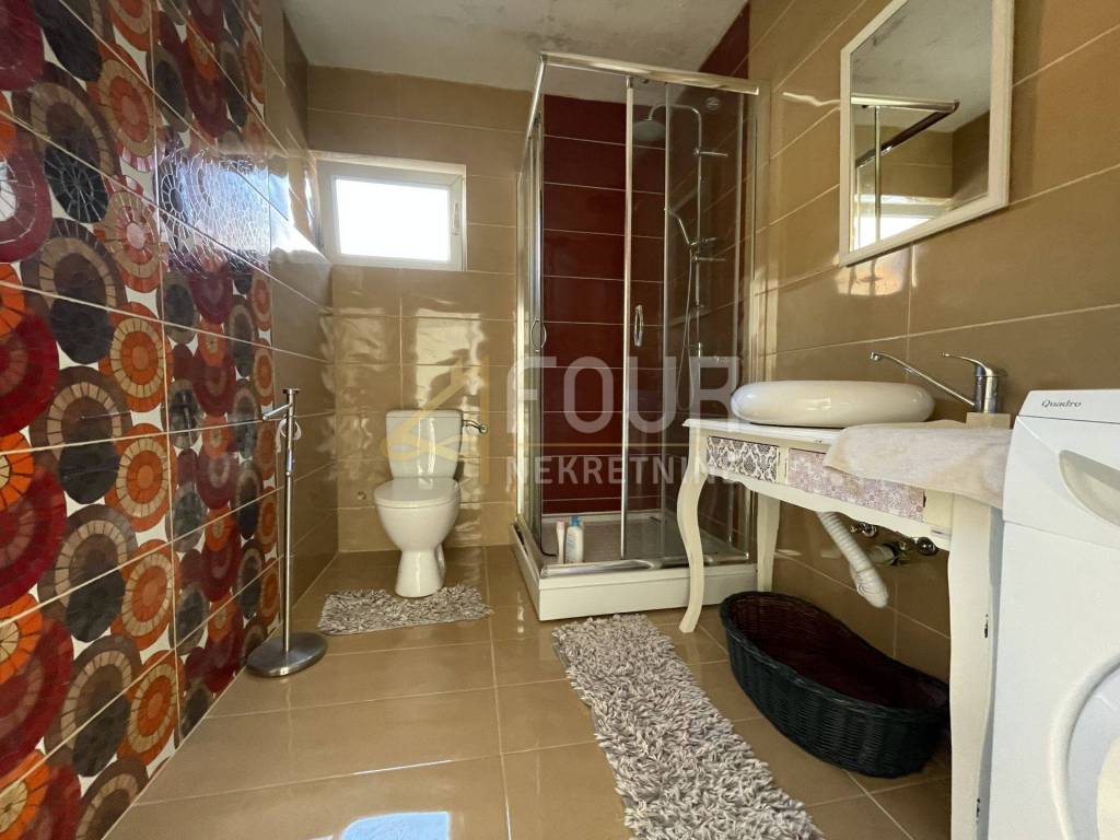 An external staircase leads to the first floor, and the apartment on the 1st floor consists of a hallway, 3 bedrooms, one of which has access to a covered balcony, an open space kitchen with a dining room and a living room with access to a large covered terrace. On the ground floor there is also a tavern with a barbecue and a separate toilet, as well as another room that can be used as a storage room.