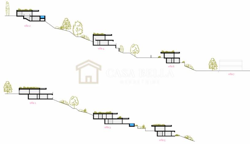 Casa Bella offers a building plot for seven Mediterranean-style urban villas. Architectural projects have been prepared for both the individual villas and the overall development. The planned villas will have floor areas of 356, 316, 267, 276, 272, 264, and 540 square metres.