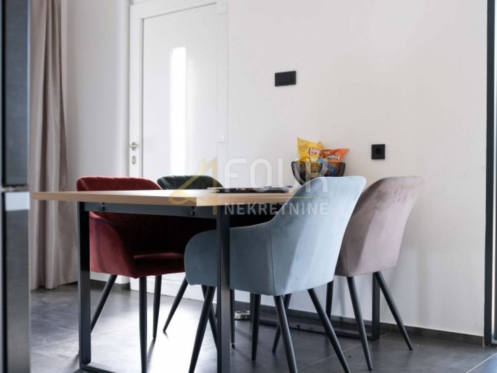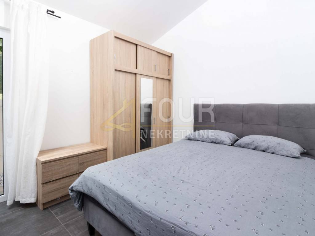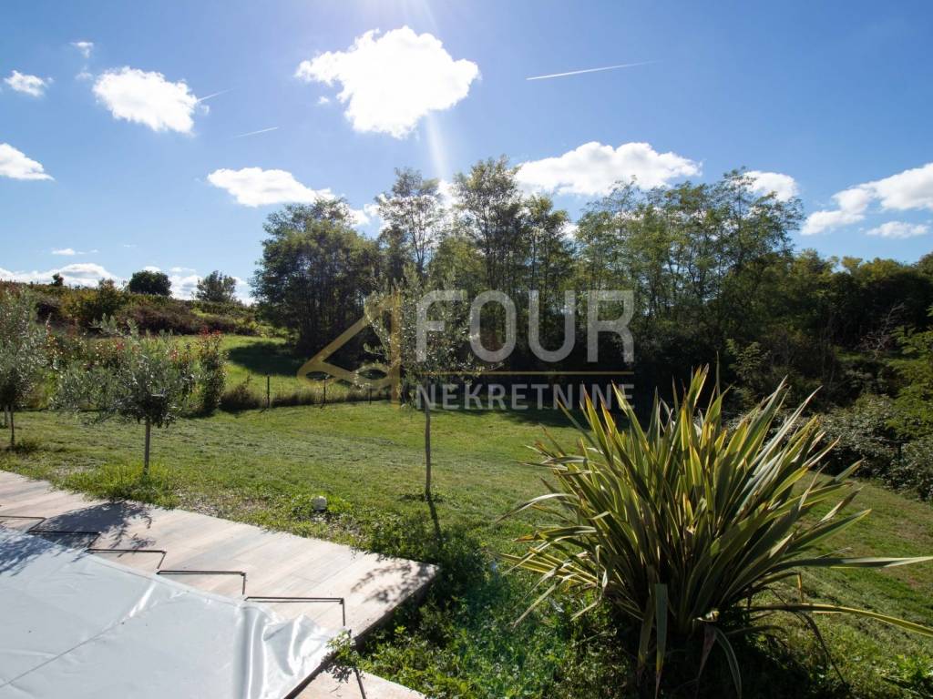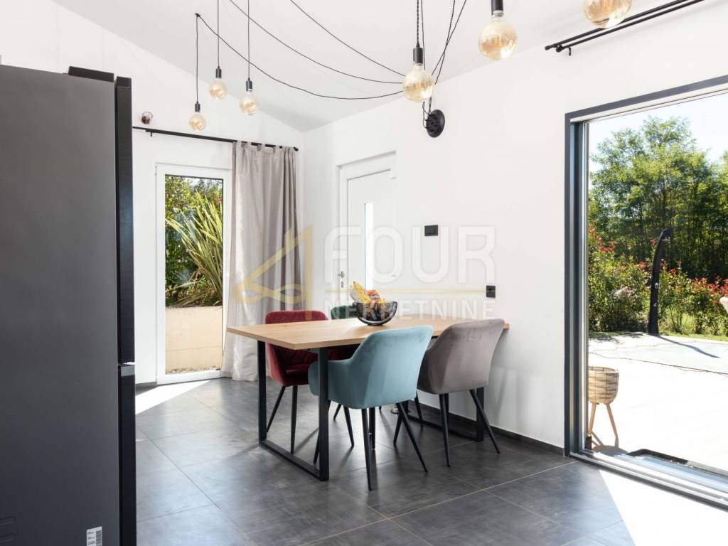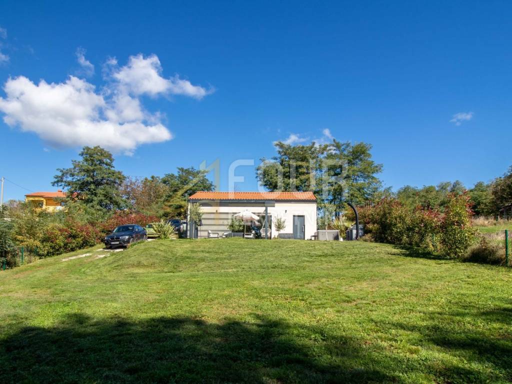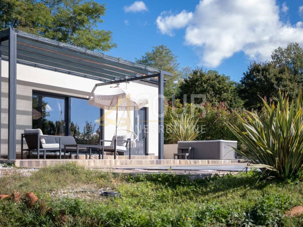 A modern holiday home with a swimming pool, located in a peaceful area near Višnjan – ideal for relaxation and enjoying privacy! The house is a single-storey building with a total area of 66 m² and a beautiful garden of 878 m². Facing south, it is filled with natural light and offers a wonderful view of the pool and the vineyard. The layout is simple and functional – the southern side includes the kitchen and open-space living room with access to the terrace, while the northern side consists of two bedrooms and a bathroom. The interior is decorated with pleasant materials and furniture.