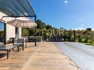 On the plot, there is a swimming pool, a landscaped terrace with complete privacy thanks to dense greenery that forms a natural fence, and a spacious parking area with space for up to five cars (three planned).