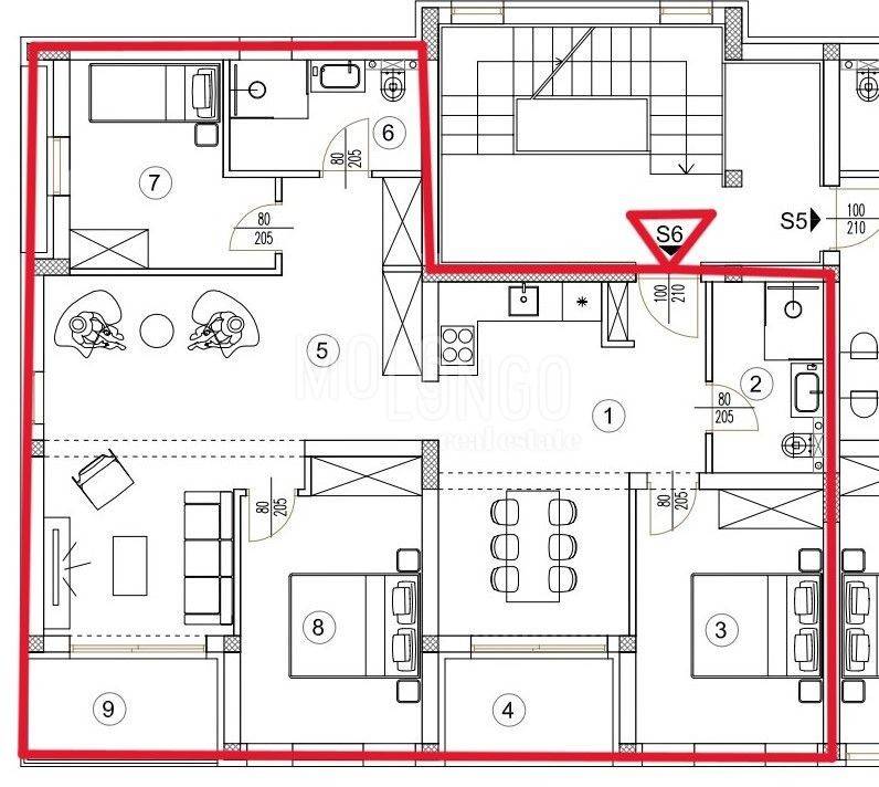 The apartment consists of an entrance hall, a kitchen and a dining room with access to a loggia located on the south side, a spacious living room with access to a covered terrace, also located on the south side of the building, which guarantees plenty of natural sunlight throughout the day. The apartment also has three spacious bedrooms and two bathrooms.
