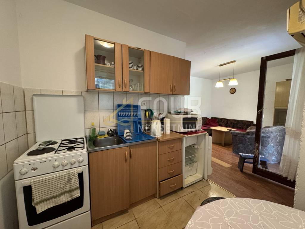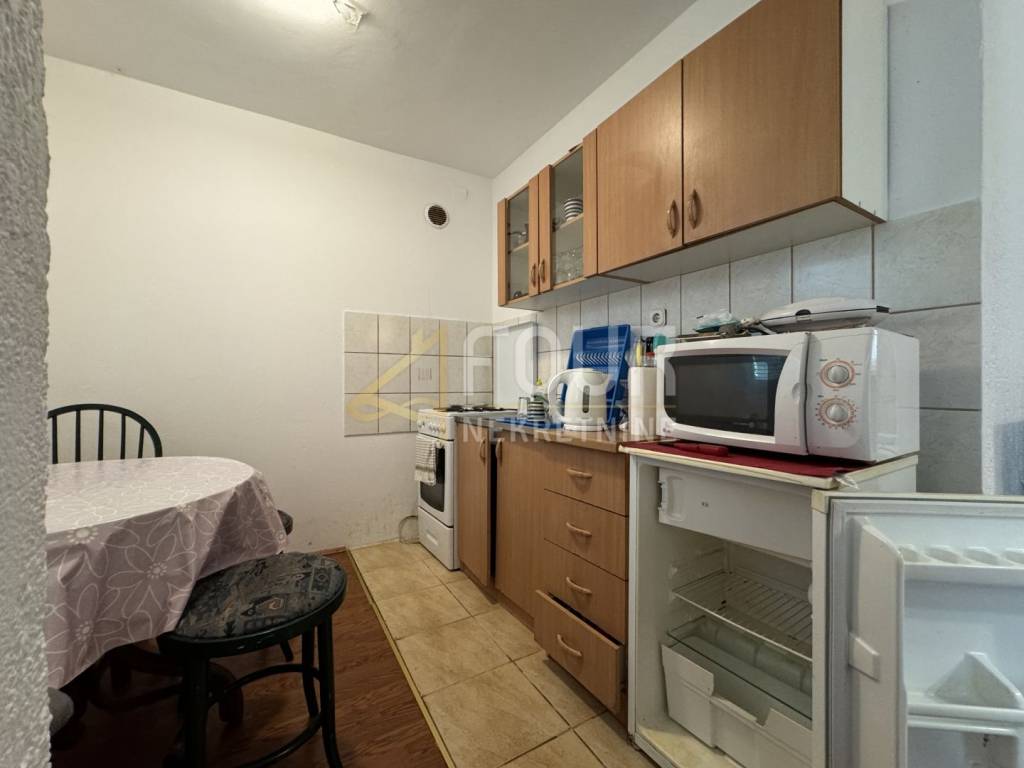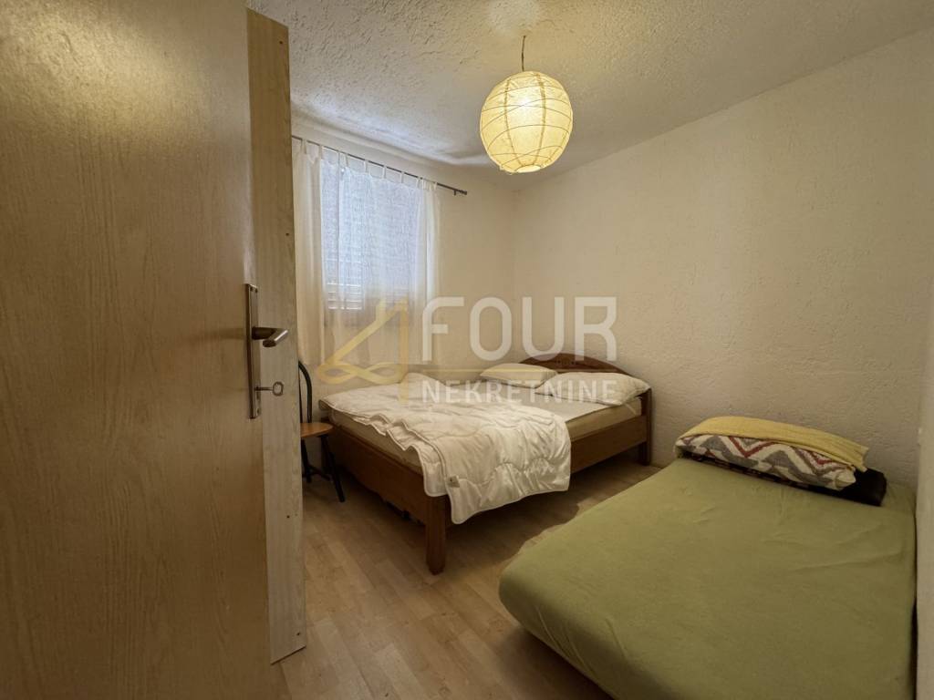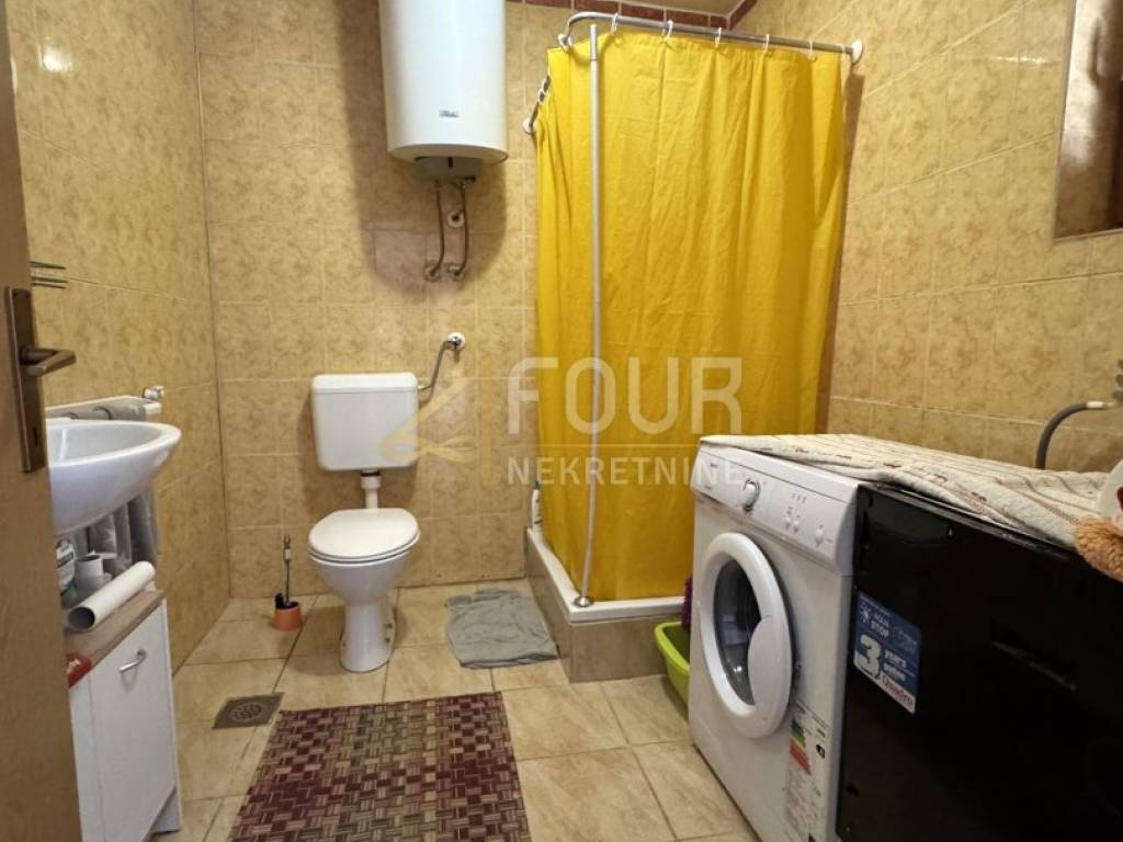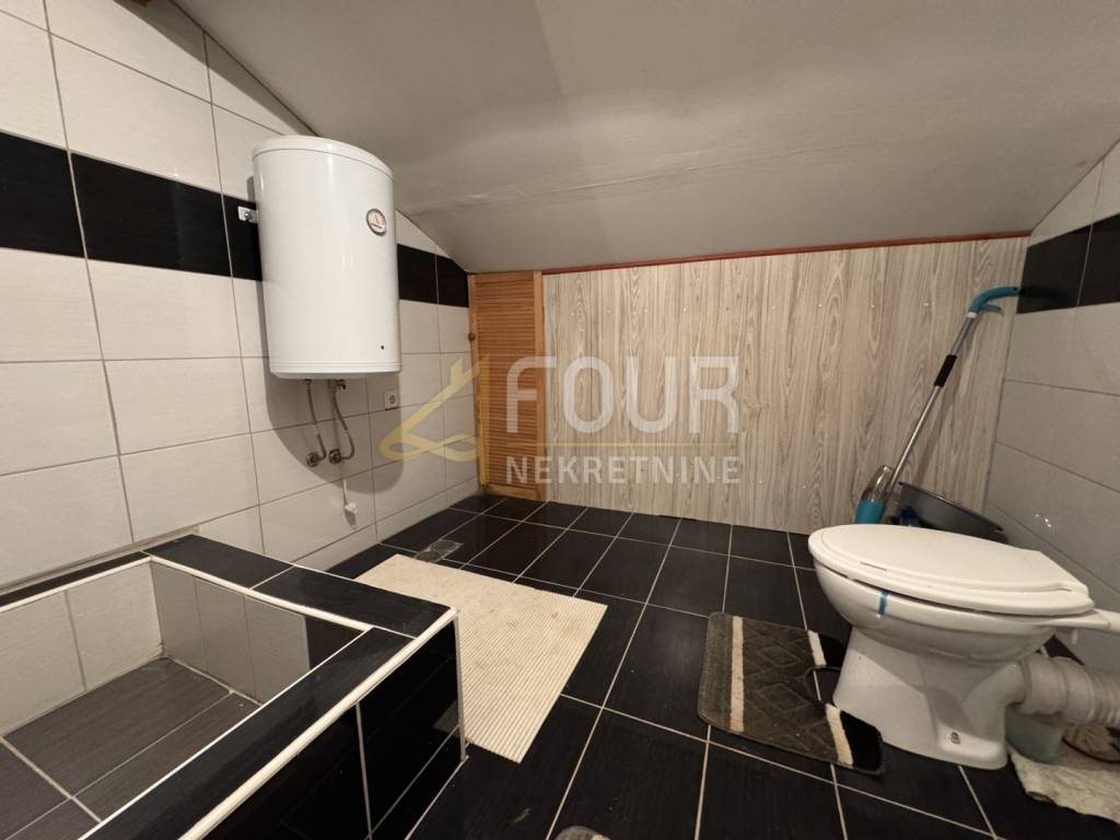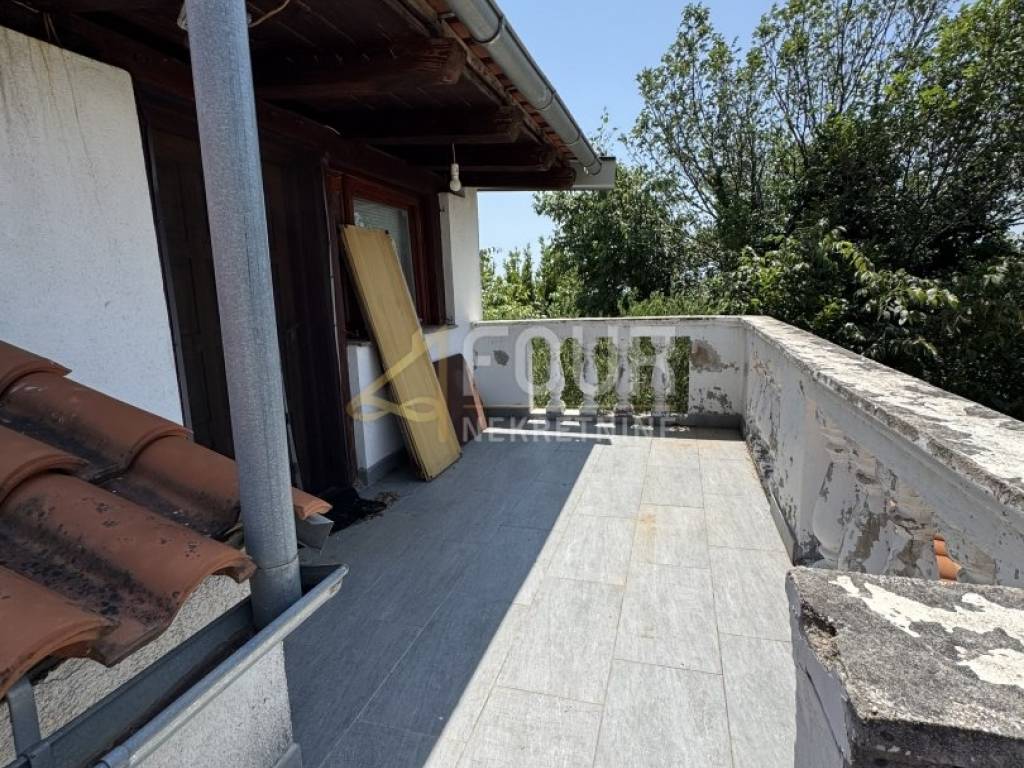 The house is divided into a ground floor and a high attic, with a total living area of 115 m². On the ground floor, there is an apartment of 58 m² consisting of three bedrooms, a living room with access to a covered terrace, a kitchen, and a bathroom. The high attic, accessed by an external staircase, includes a second apartment with a kitchen and living room, a bathroom, and one unfinished room that can be customized according to the future owner’s wishes and needs. Part of the yard is designated for parking, and there is also the possibility to build a swimming pool.