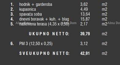 We are selling an apartment in a new residential complex in Štinjan. The complex consists of 19 two-story residential buildings. The location of the new residential complex is excellent, just a kilometer away from the center of Štinjan and in the immediate vicinity of the elementary school, kindergarten, Hidrobaza city beach, pharmacy, and only four kilometers from the center of Pula and three kilometers from the center of Fažana.Access to the residential complex is provided from an asphalted surface, within which all the necessary infrastructure will be located (electricity, water, sewage).Apartment marked 6C is located on the 1st floor of the building and consists of: hallway, living room with kitchen and dining area, bedroom, bathroom and terrace.What makes this project special is the architectural design of the facade of the residential buildings, and the green roofs that appear on the facade.Each residential unit is provided with the required number of parking spaces according to the urban plan of the city of Pula, dimensions 2.50m" x 5.00m". Each parking space is designed with a future connection to the electricity grid in order to connect electric vehicle chargers.This apartment has a parking space included in the price.We accept reservations!For additional information, please contact:Azra+385 91 611 5706+385 98 420 885azra@almadominvest.com