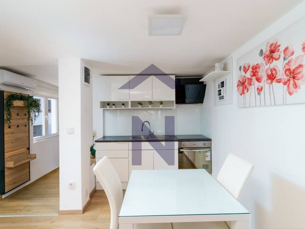 Stan se iznajmljuje namješten i opremljen kao na fotografijama, opremljen je perilicom rublja, pećnicom, napom, indukcijskom pločom te hladnjakom.