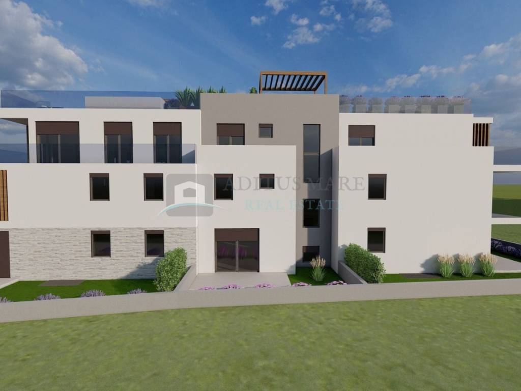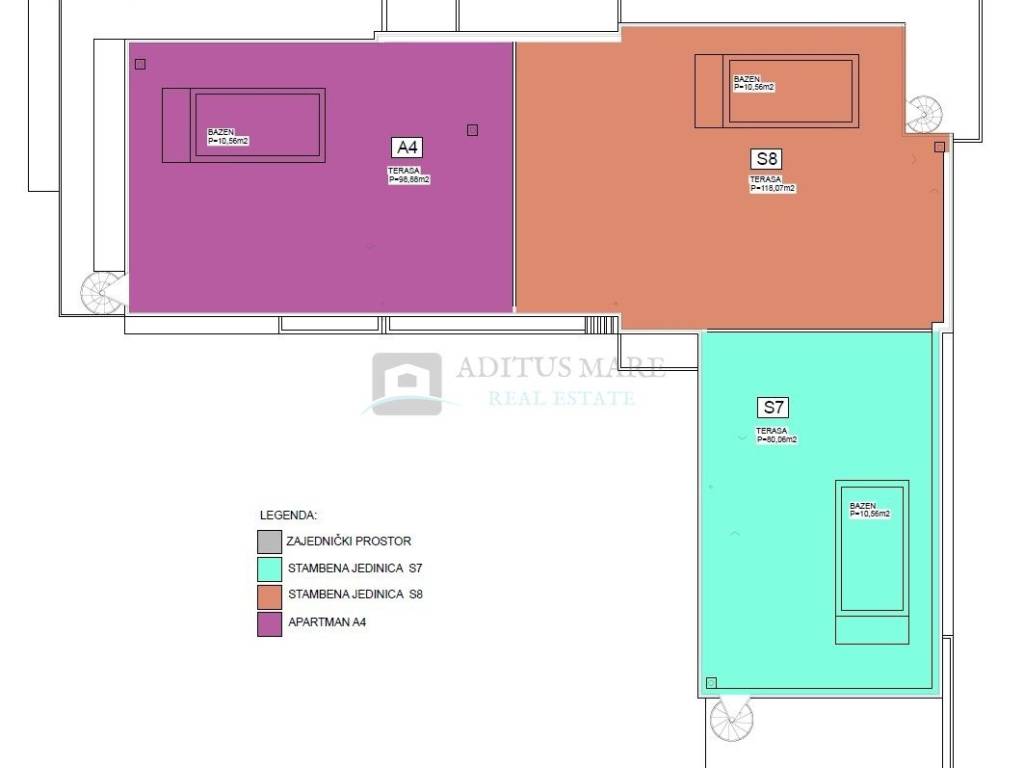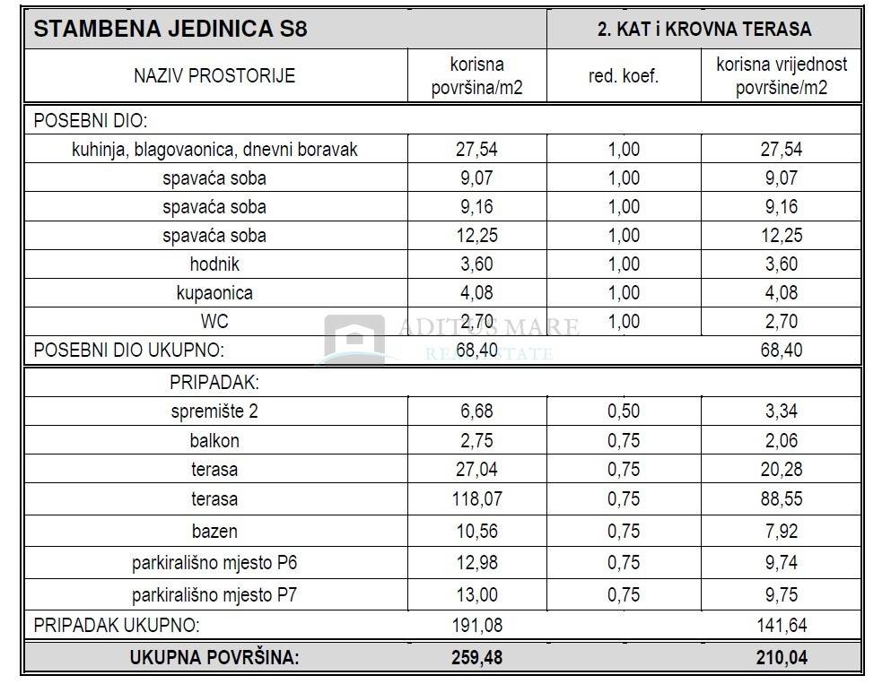 Krovna terasa 118,07 m s bazenom 22 m, sunčalištem, ljetnom kuhinjom i WC-om + 2 garažna mjesta.