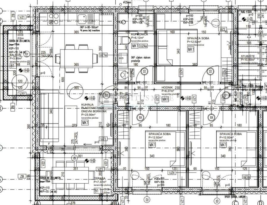 Stan obuhvaća ulazni prostor od 6,27 m, tri spavaće sobe veličina 12,92 m, 12,92 m i 11,50 m, kupaonicu od 5,89 m te zaseban WC od 1,37 m. Dnevni boravak, blagovaonica i kuhinja čine otvoreni prostor od 23,90 m, a iz stana se izlazi na balkon površine 6 m i terasu površine 7,37m.
