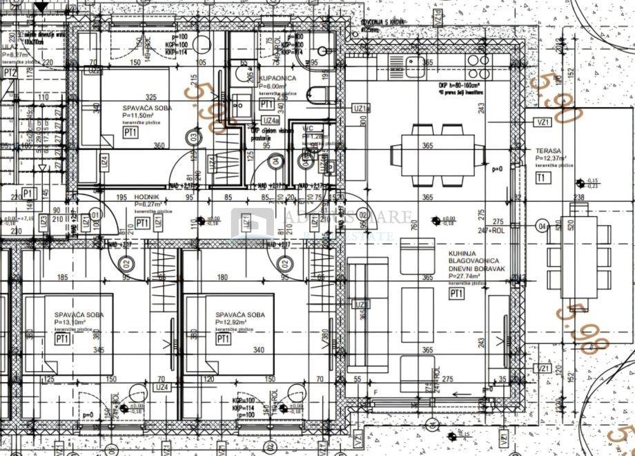 Stan obuhvaća ulazni prostor od 6,27 m, tri spavaće sobe veličina 12,92 m, 12,92 m i 11,50 m, kupaonicu od 5,89 m te zaseban WC od 1,37 m. Dnevni boravak, blagovaonica i kuhinja čine otvoreni prostor od 27,74 m, a iz stana se izlazi na balkon površine 10 m.
