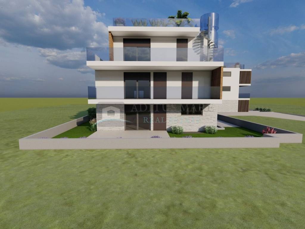 3 spavaće sobe, garderoba, kupaonica + dodatni WC, open-space dnevni boravak, kuhinja i blagovaonica, balkon. Vanjsko stubište vodi na privatnu krovnu terasu (80,06 m) s bazenom 22 m, sunčalištem, ljetnom kuhinjom i dodatnim WC-om. Uključena 2 garažna mjesta.