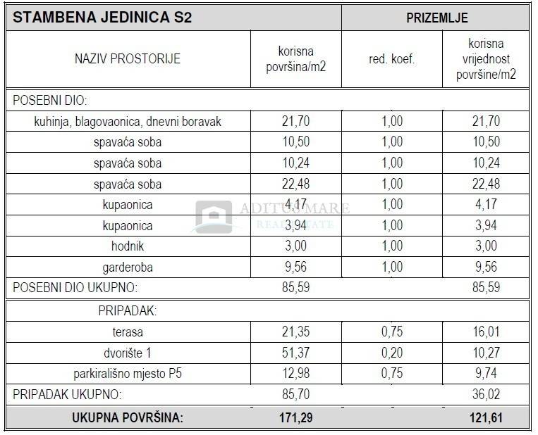 3 spavaće sobe, 2 kupaonice, garderoba, otvoreni dnevni boravak s kuhinjom i blagovaonicom, terasa, dvorište 51 m + garažno mjesto.