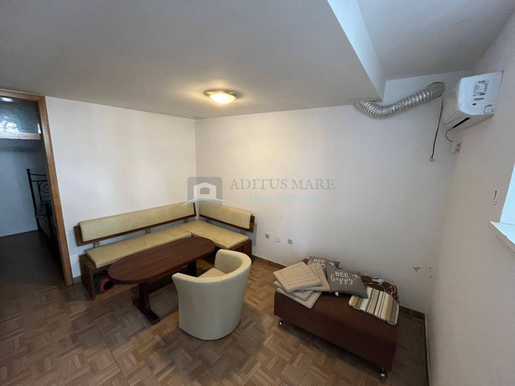 U prizemlju kamene kuće koja je smještena u strogom centru Vodica, nalaze se dva dvosobna stana te su isti namješteni i kao takvi se prodaju. Etažno vlasništvo prizemlja ima površinu od 128m2 te oba stana imaju zasebne ulaze, jedan je sa prednje strane kuće dok je drugi sa druge strane kuće.
